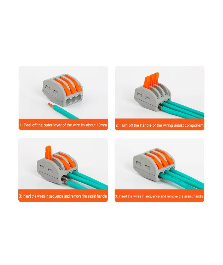 Skruvfria kopplingsklämmor som kan användas för både mjuka och styva ledare samtidigt. De har ett praktiskt anslutningssystem med orange vippbygel, vilket gör det enkelt att få in de mjuka ledarna i hålen.