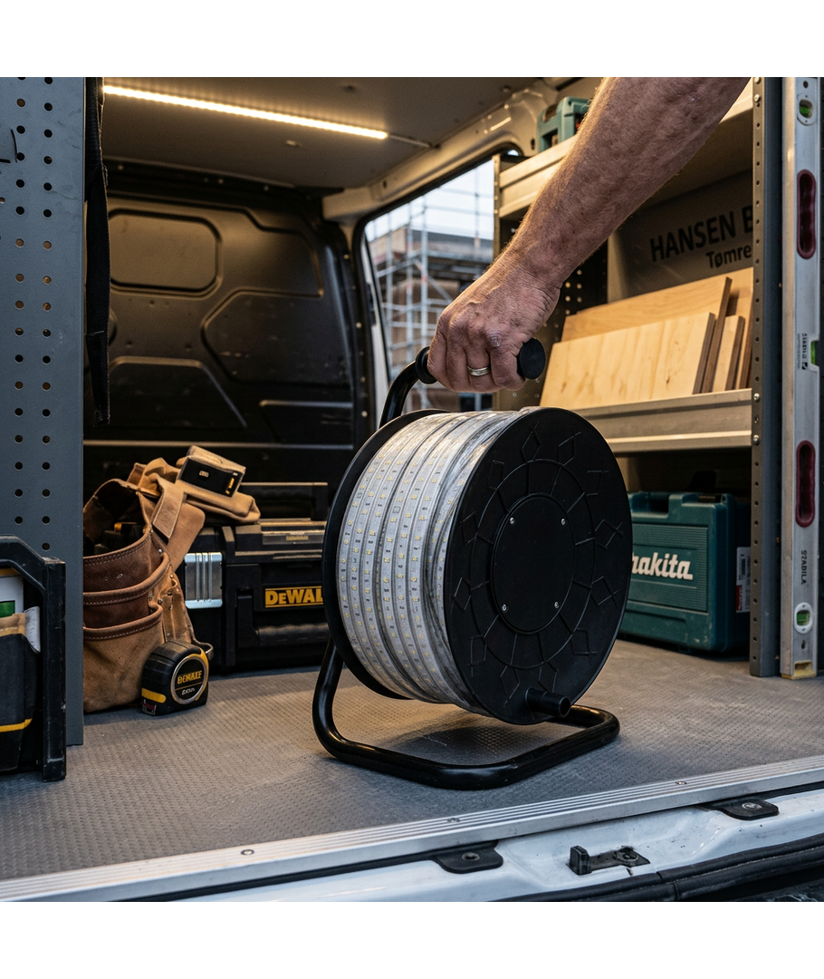 Driftsäker LED-ljusslang på praktisk trumma som levererar ett jämnt och kraftfullt ljus för både inom- och utomhusbruk. Perfekt för byggarbetsplatser, verkstäder och andra områden med behov av tillfällig belysning.