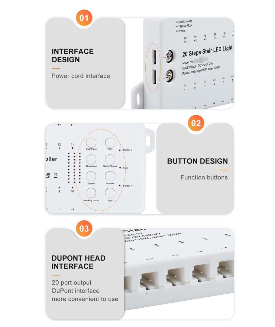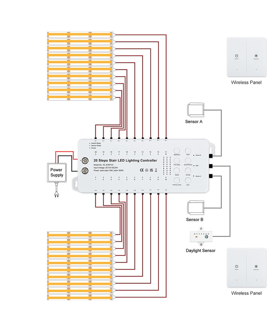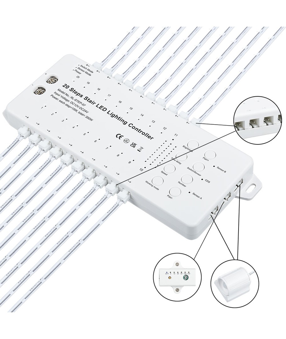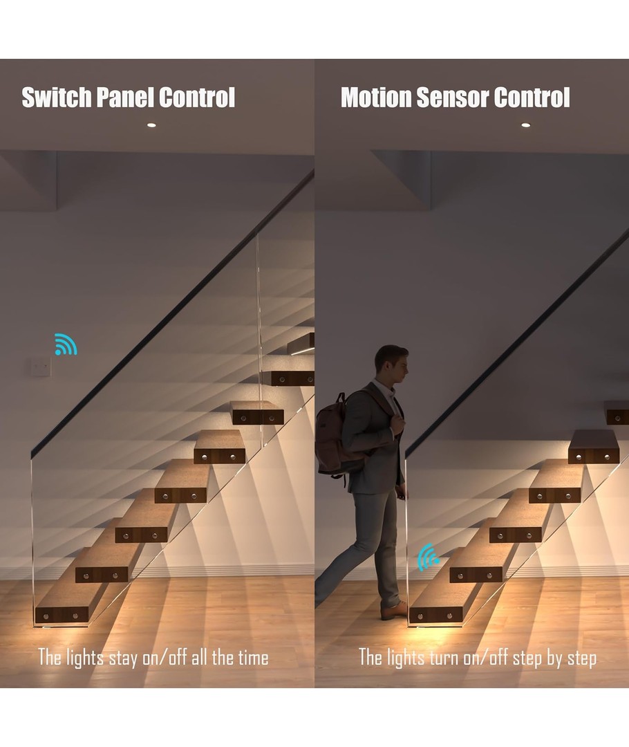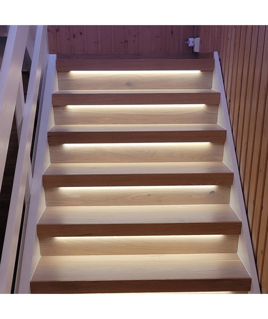 De 2 PIR-sensorerna är placerade i var sin ände av trappan så att ljuset tänds när du antingen ska upp eller ner för trappan. En effekt kan skapas utifrån vilken sensor som är aktiverad.