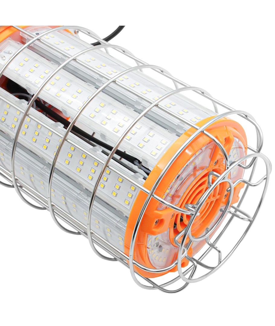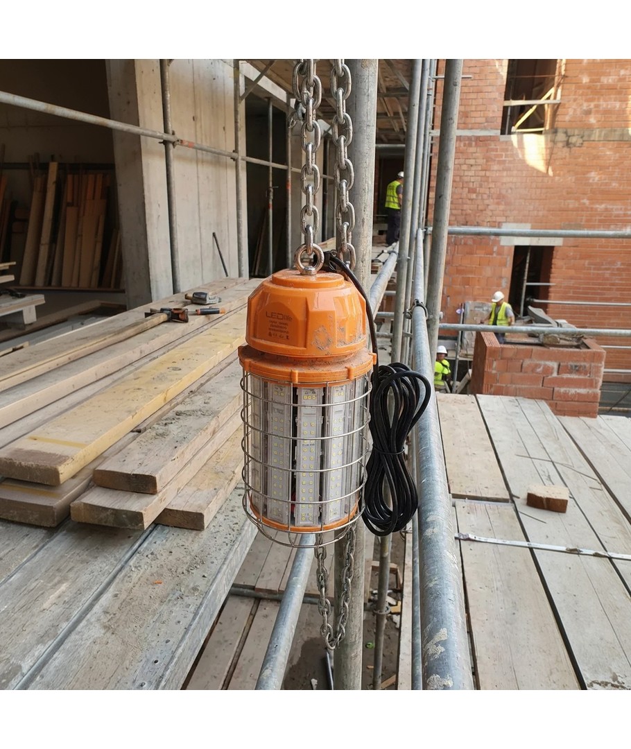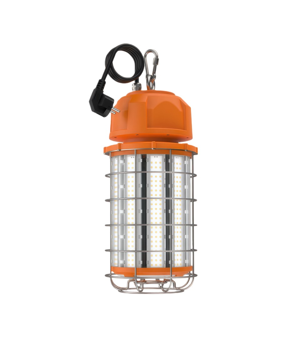 Den robusta konstruktionen med skyddande metallgaller gör lampan idealisk för byggarbetsplatser, verkstäder och andra krävande miljöer.