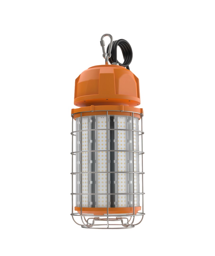 Den robusta konstruktionen med skyddande metallgaller gör lampan idealisk för byggarbetsplatser, verkstäder och andra krävande miljöer.