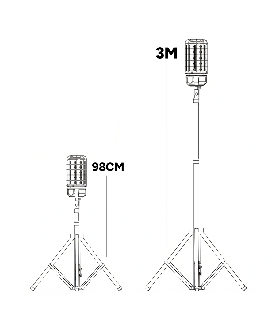 3,4m Stativ: Levereras färdigmonterad på ett justerbart stativ som enkelt fälls ut och snabbt kan justeras i höjdled.