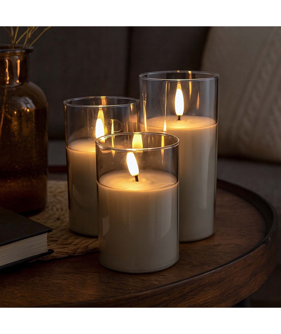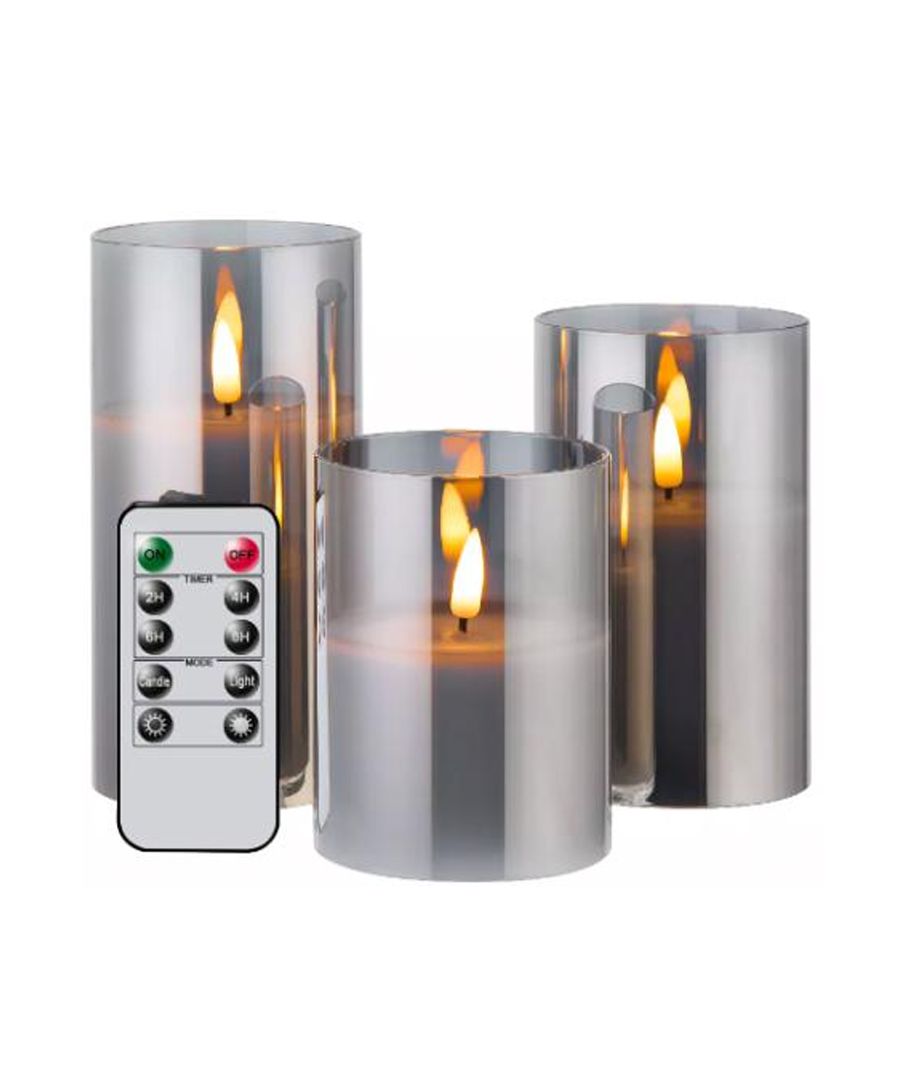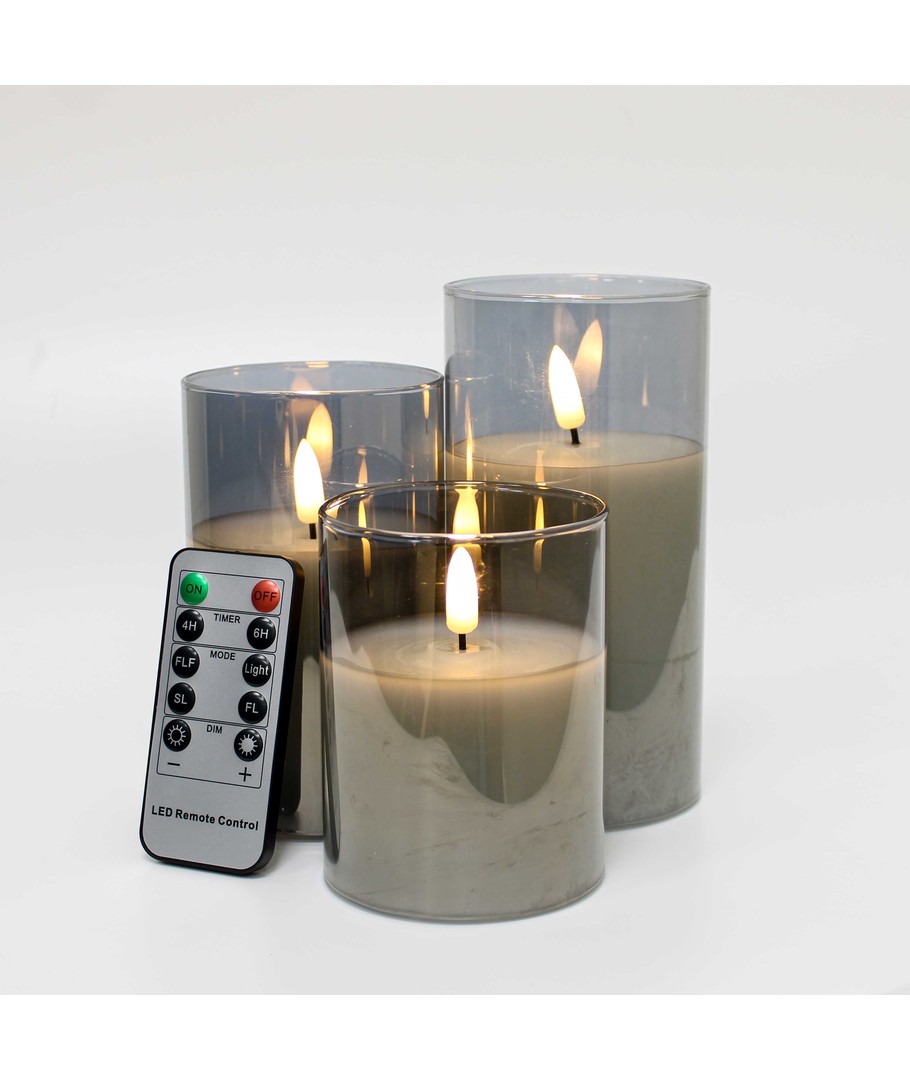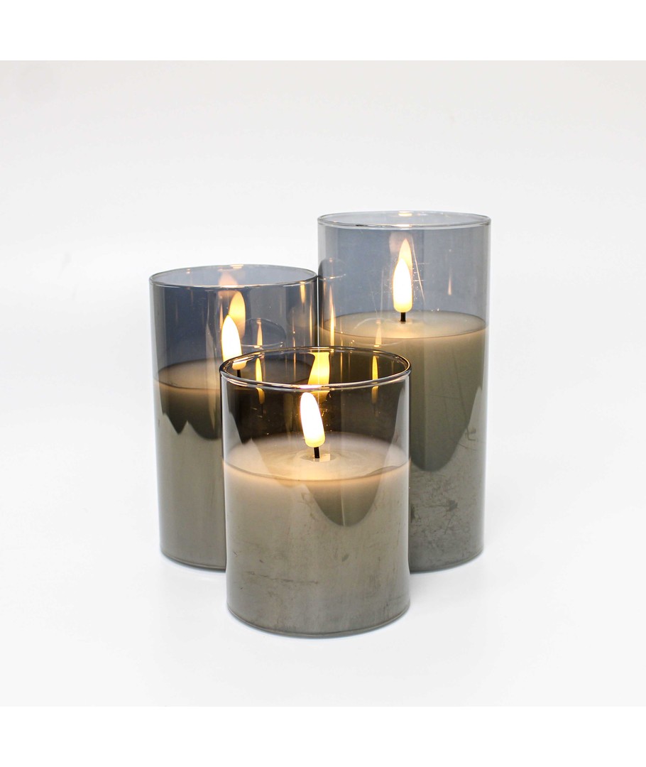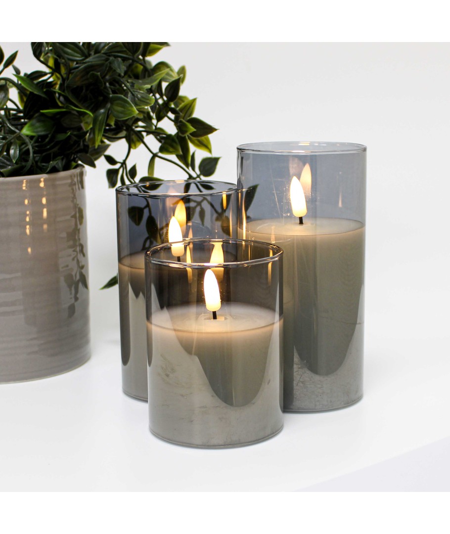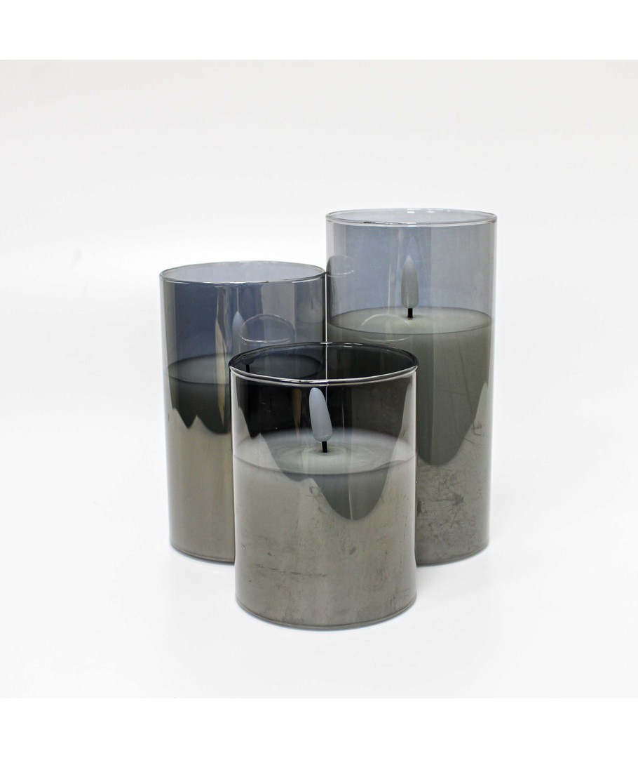 Upplev den fängslande skönheten och stämningen från levande ljus utan risk med vårt LED Blockljus set i gråtonat glas. Detta eleganta set innehåller tre ljus i olika höjder med en realistisk flameffekt som skapar en varm och inbjudande atmosfär.