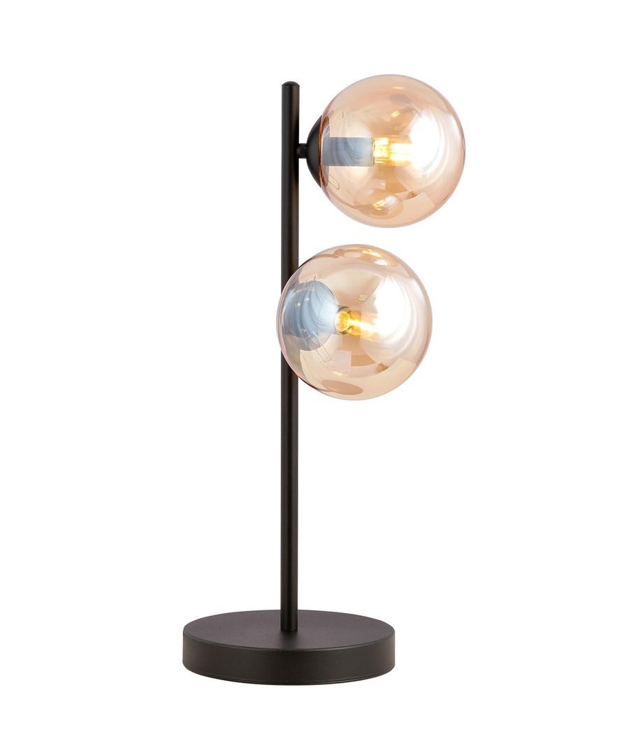Dess unika design erbjuder en bärnstensfärgad, klotformad skärm som mjukt lyser upp varje rum med ett varmt sken. Med en höjd på 38 cm passar den perfekt både som skrivbordslampa och stämningsbelysning i vardagsrummet. Lampans stomme är tillverkad av pulverlackerat stål, vilket garanterar hållbarhet och ett stilfullt utseende. Trots att ljuskällan inte medföljer, gör de två E14-socklarna det lätt att anpassa lampans ljusstyrka efter dina behov.