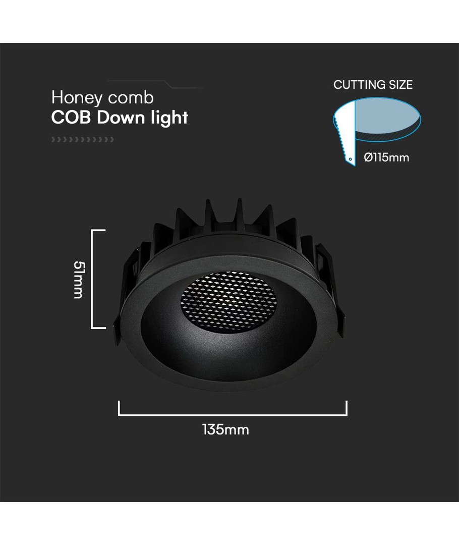 Den är designad för enkel installation med en hålstorlek på 115 mm, och hela armaturen har en kompakt dimension av 51 x Ø135 mm. Detta gör att den passar bra i de flesta tak och utrymmen utan att ta upp onödig plats.