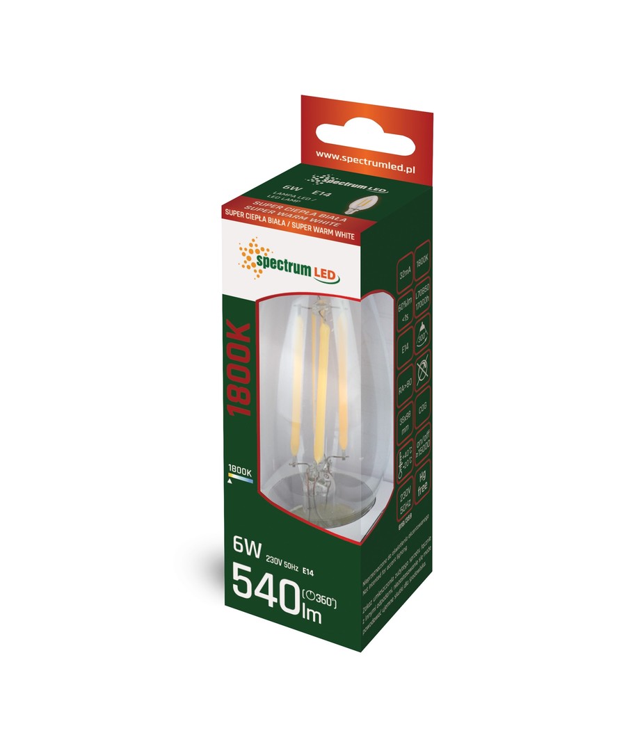 Upptäck en ny generation av belysning med vår Spectrum 6W LED-lampa, designad för att ge ett extra varmvitt sken. Med sin eleganta C35 filamentform erbjuder denna LED-lampa både estetik och funktionalitet.