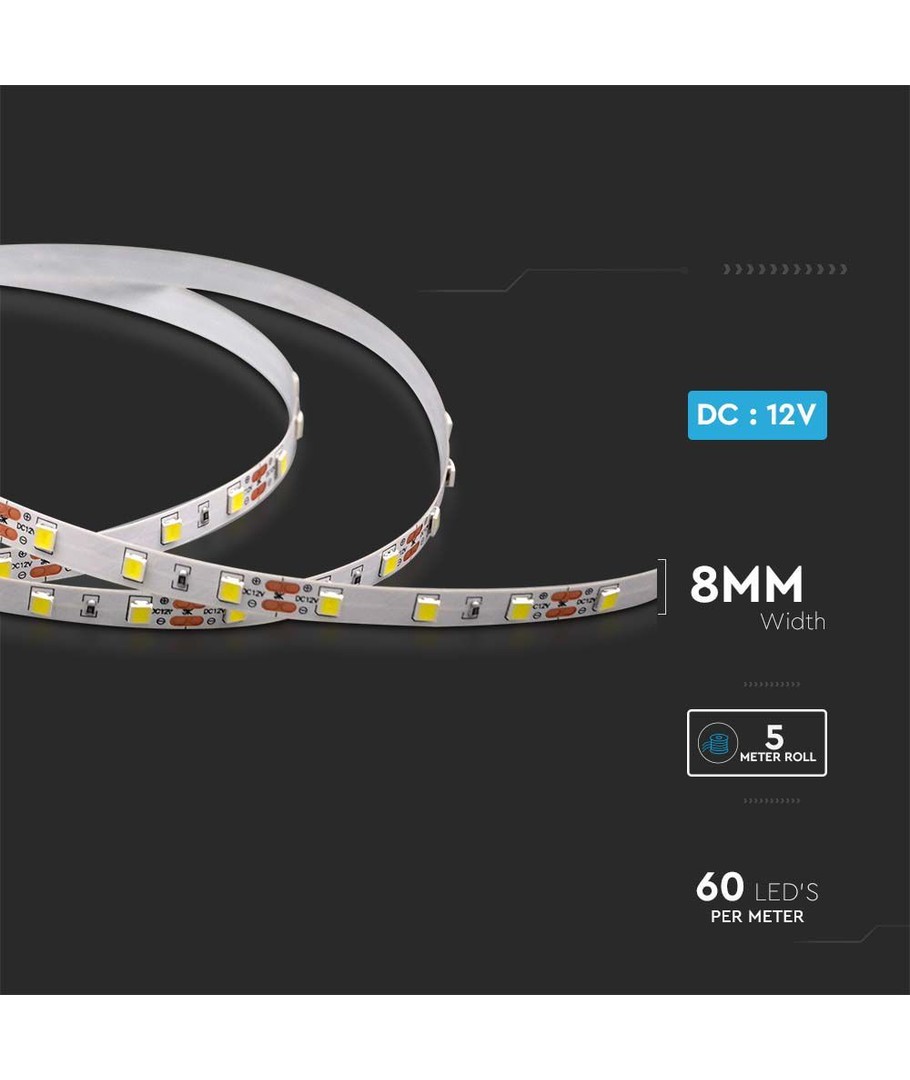Denna LED-strip erbjuder 8W/meter och är perfekt för olika belysningsbehov tack vare sin jämna ljusfördelning. Med en ljusstyrka på 800 lm/meter och en bred spridning på 120 grader garanterar den en effektiv ljusutbredning.
