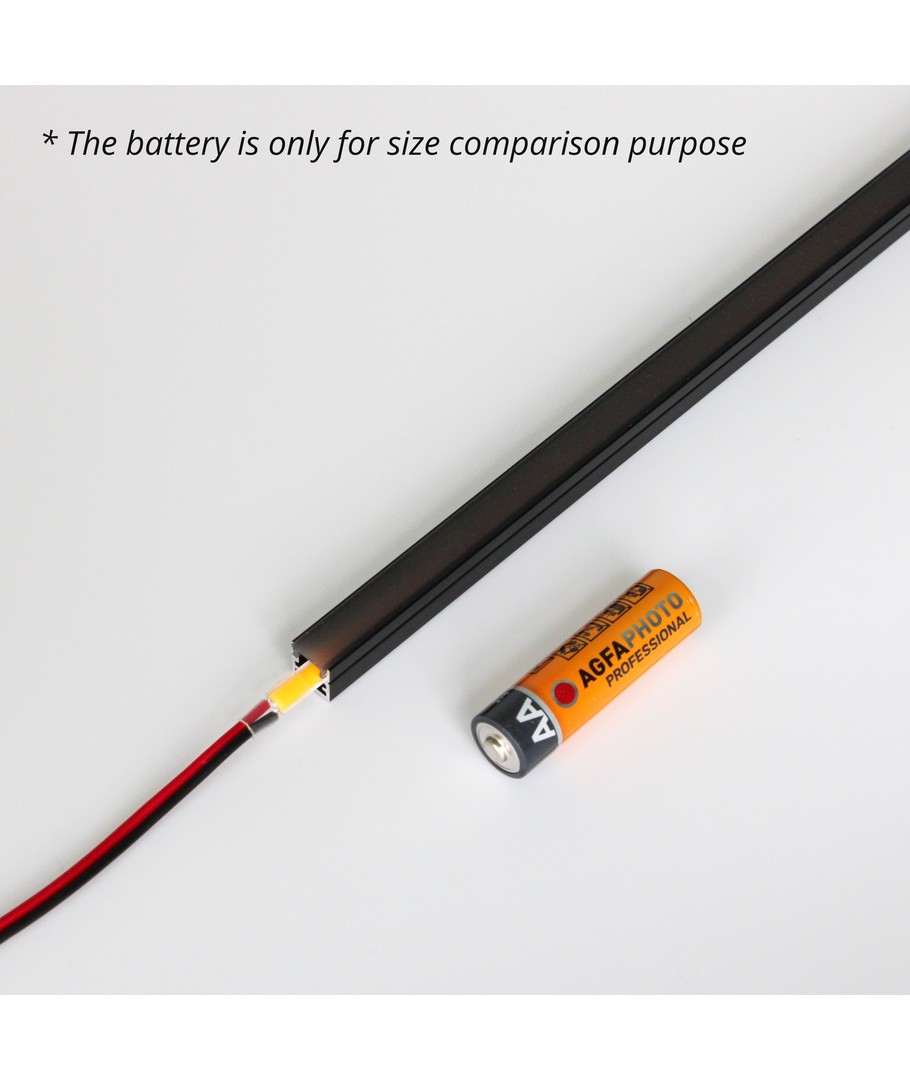 Den svarta aluminiumprofilen monteras enkelt mellan lamellerna på akustikpanelerna, vilket skapar en genomgående enhetlig och stilren look. Den 2 meter långa kabeln gör det enkelt att ansluta strippern till en 24V strömkälla. Välj ett lämpligt nätaggregat baserat på antalet meter LED-strip du behöver. Kom ihåg att även överväga en dimmer för justerbar ljusstyrka.