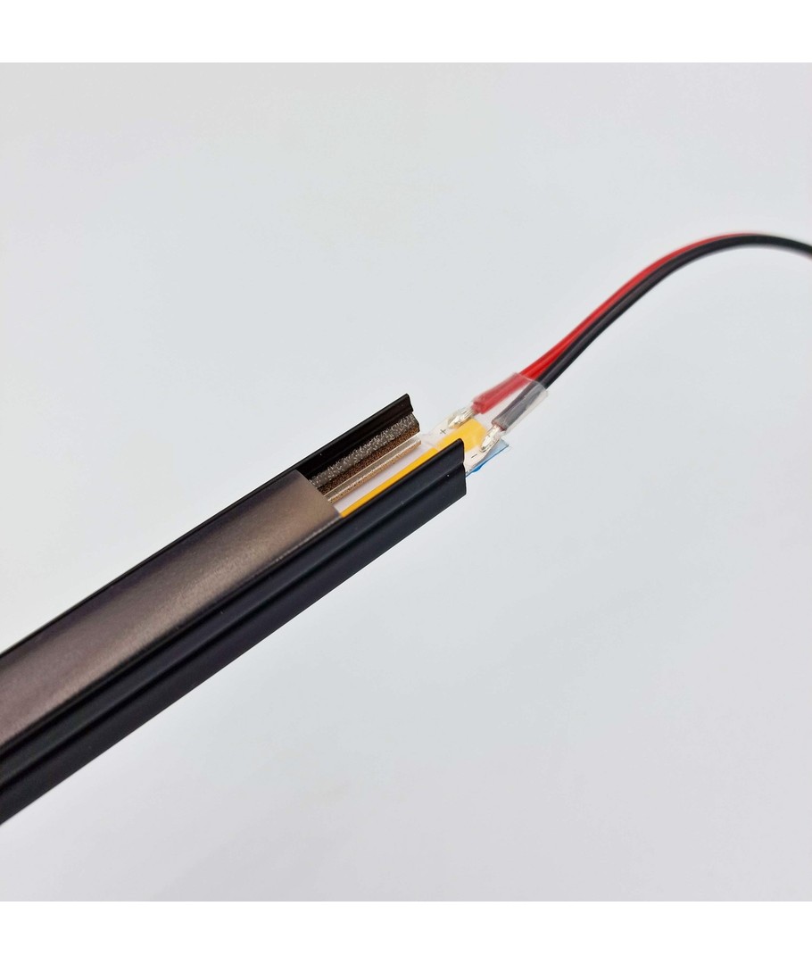 Den svarta aluminiumprofilen monteras enkelt mellan lamellerna på akustikpanelerna, vilket skapar en genomgående enhetlig och stilren look. Den 2 meter långa kabeln gör det enkelt att ansluta strippern till en 24V strömkälla. Välj ett lämpligt nätaggregat baserat på antalet meter LED-strip du behöver. Kom ihåg att även överväga en dimmer för justerbar ljusstyrka.