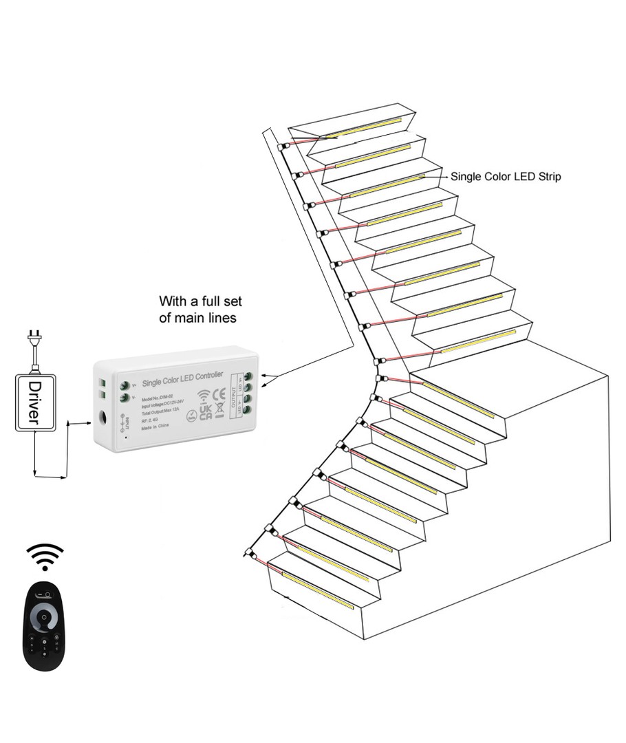 Enkel montering där en "master" ledning dras på ena sidan av trappan, där ljuset till varje steg enkelt ansluts.