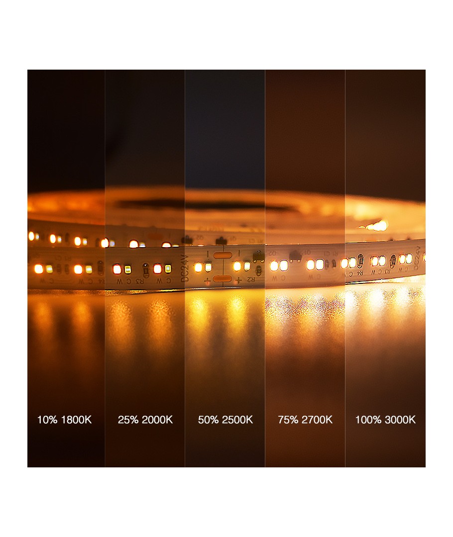 Den här LED-stripsen är den perfekta lösningen för dig som söker hög ljuskvalitet och flexibla belysningsmöjligheter. Den är utformad för att skapa en härlig atmosfär i ditt hem eller arbetsmiljö med sin unika "Dim to Warm"-funktion, vilket ger en varm och inbjudande belysning när den dimmas.