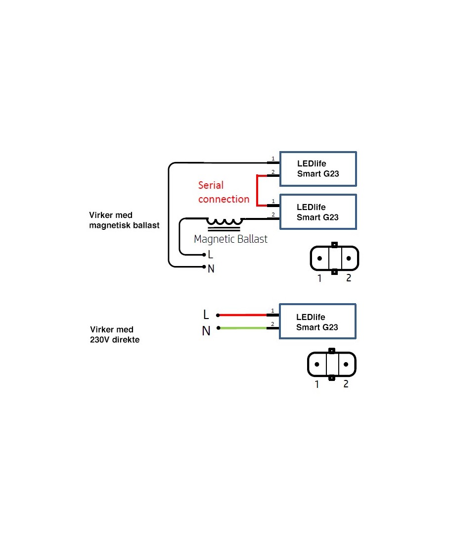 Fungerar även i lampor med två G23-lampor i serie, till en ballast.