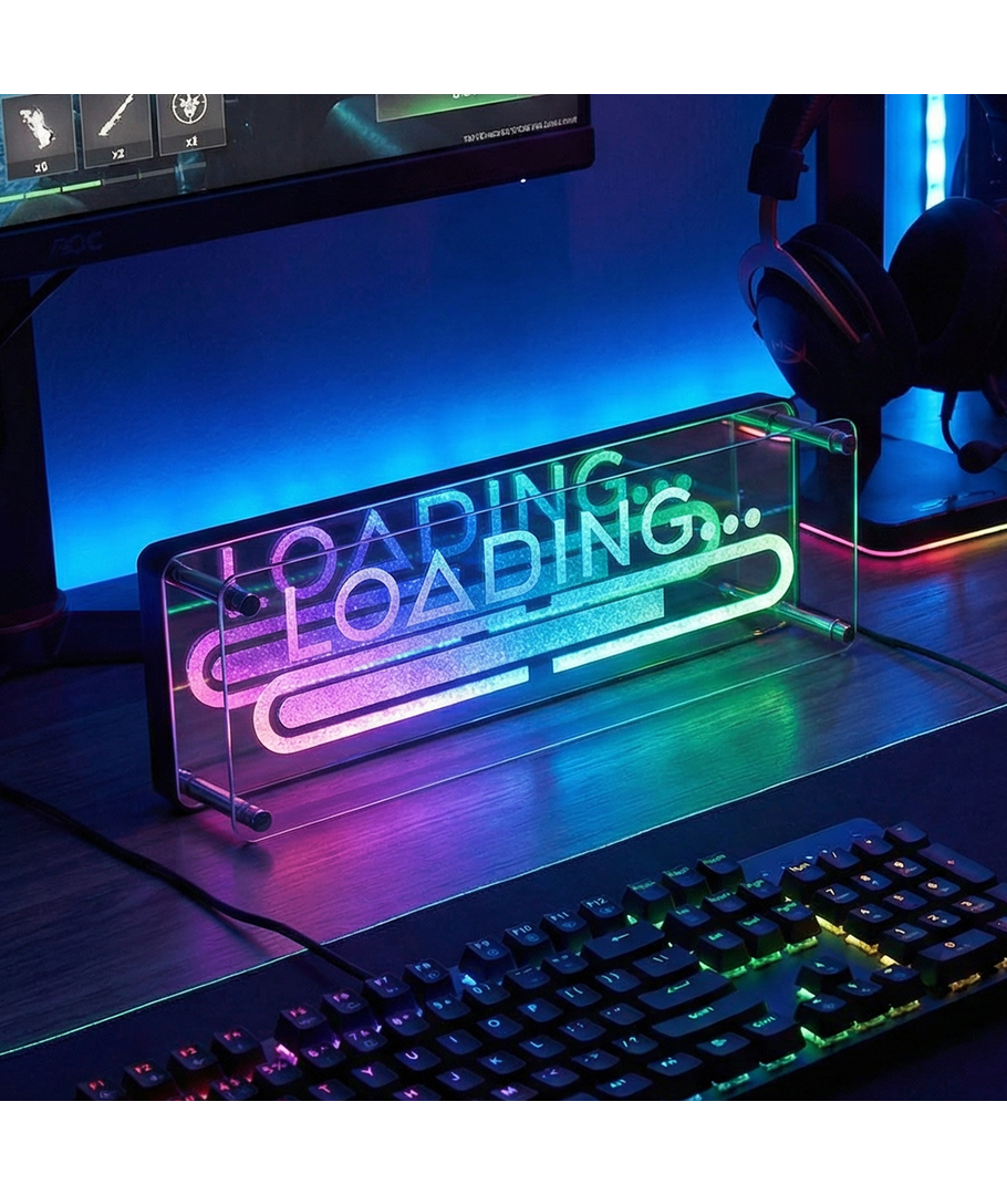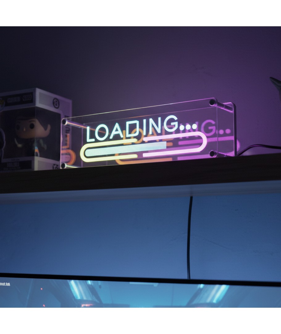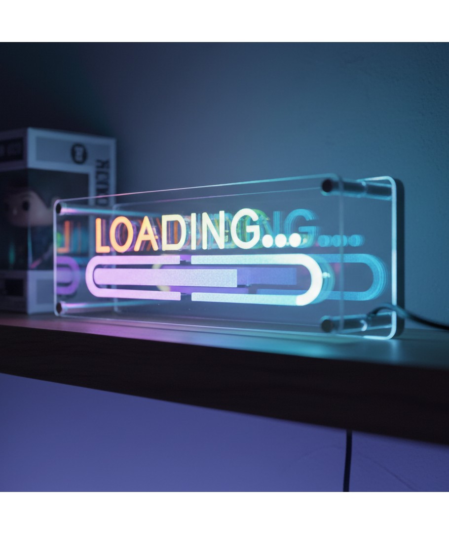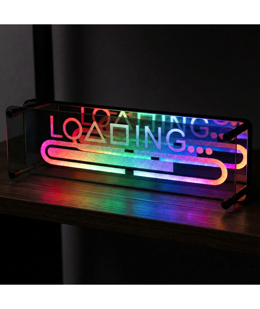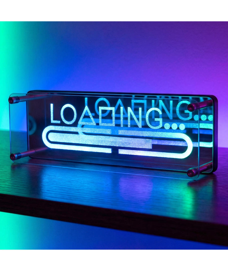 Fantastisk RGB Neonskylt med Infinity Mirror-effekt, som upprepar "LOADING" oändligt! Skylten har många lägen av häftiga RGB-effekter, som du kan styra direkt i appen. Anslut enkelt via USB-kontakt - och så är du igång!