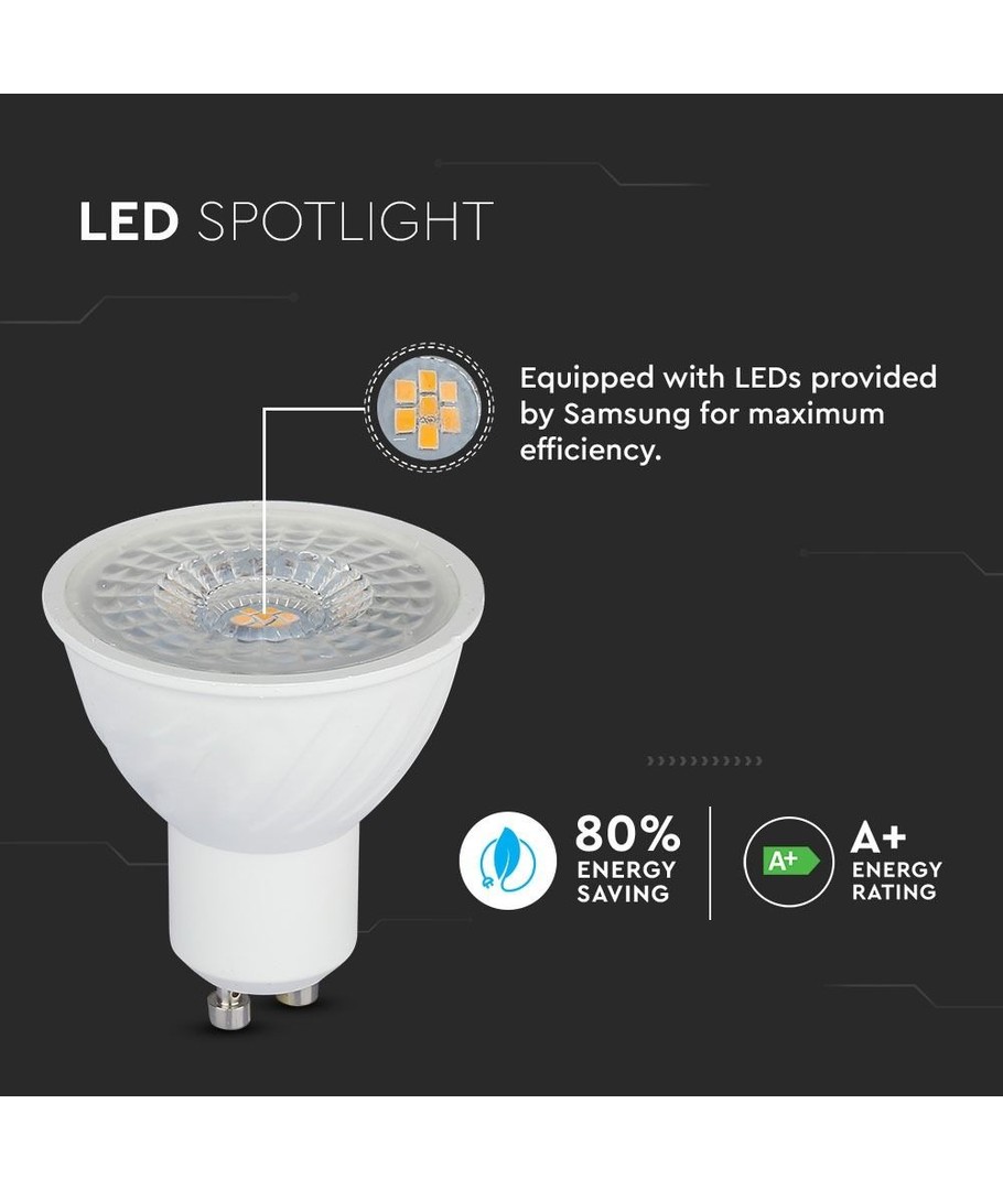 Upptäck en pålitlig och energieffektiv ljuskälla med V-Tac 6W LED spotlight. Denna spotlight använder ett högkvalitativt Samsung LED-chip, vilket ger dig både pålitlig och långvarig belysning. Byggd för att vara en ersättning för traditionella 55W lampor, erbjuder denna LED-spotlight topprestanda med en bråkdel av energianvändningen.