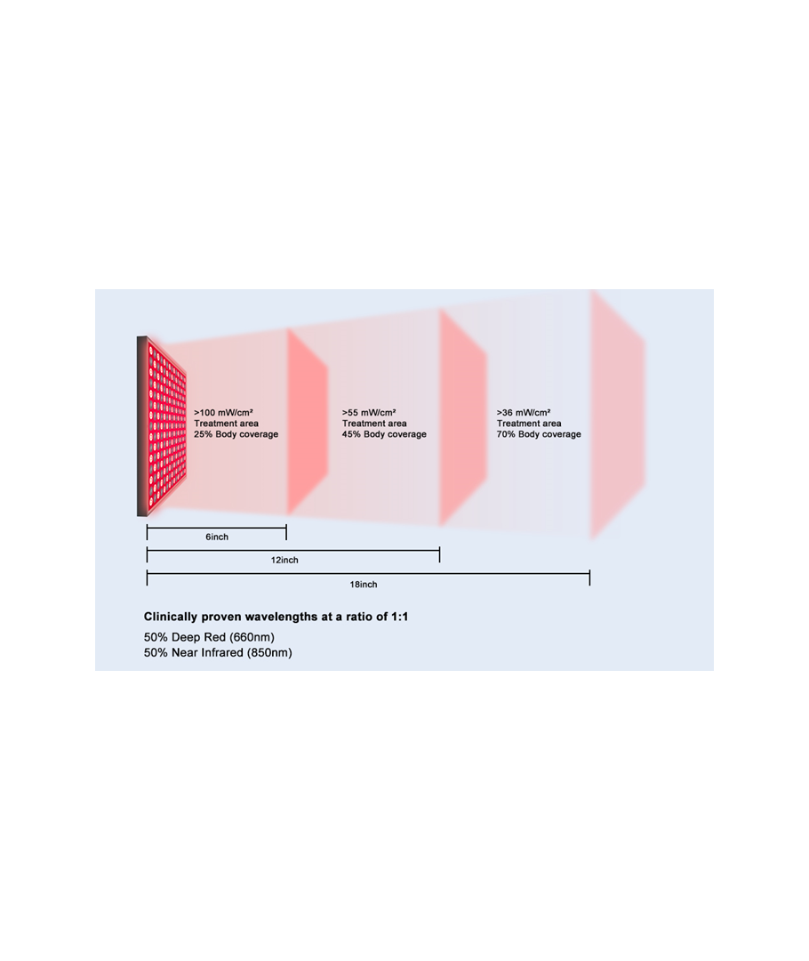 Detta beror på att ljusets intensitet (irradiansen) spelar en kritisk roll för hur djupt ljusets energi tränger in i kroppen. Det innebär att det inte är tillräckligt att bara förlänga exponeringstiden framför en ljuspanel med lägre styrka. Djupet av ljusets penetration i kroppen ökar inte med längre tid, utan beror uteslutande på ljusstyrkan.