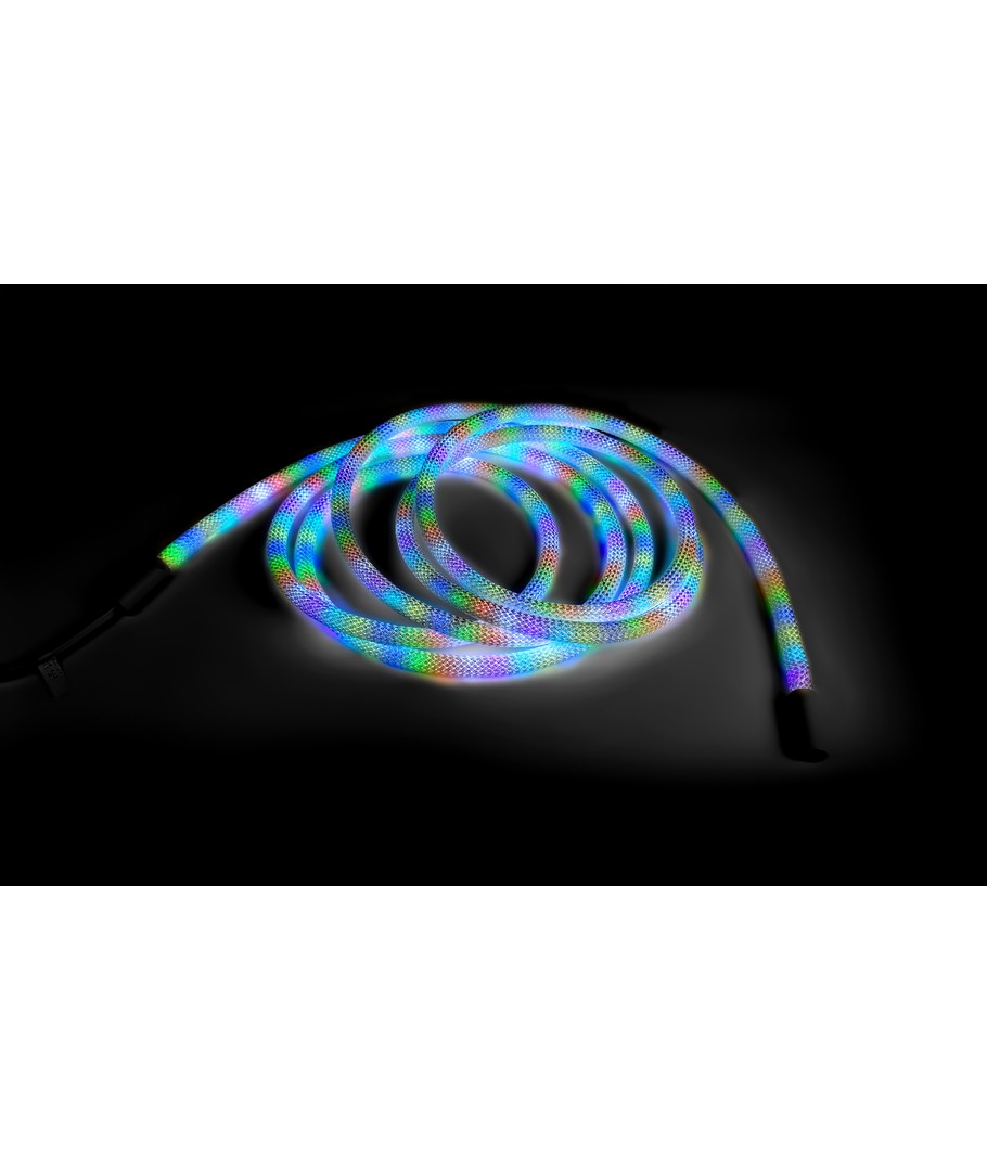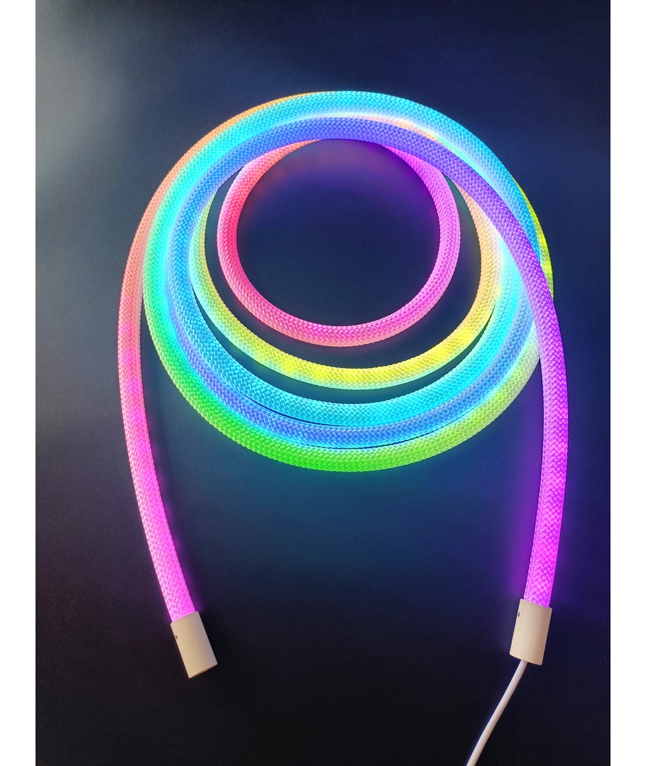 Upplev en värld av färger med vår 3W/m RGBIC Neon Flex strip med vävt rep - en 5 meter RGBIC neon flex, som ger ljus och liv till vilket rum som helst med sitt dynamiska färgspel och flexibla design.