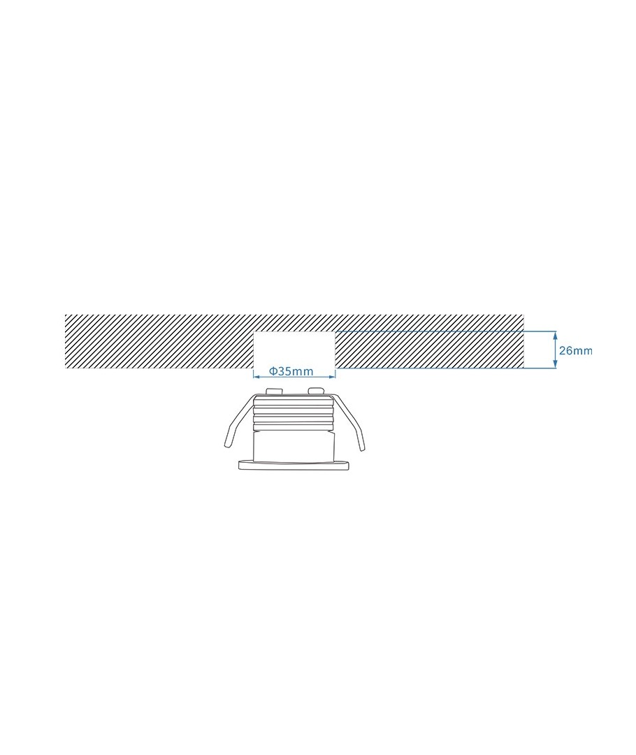 Produkten har dimensionerna 28 x Ø38 mm och kräver en hålstorlek på Ø35 mm. Den är speciellt utformad för infällning, vilket gör den till ett utmärkt val för möbler och tak där en sömlös belysning önskas.