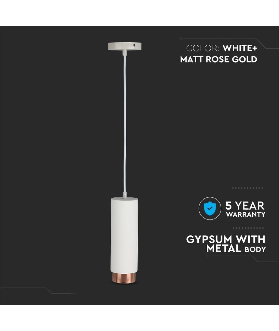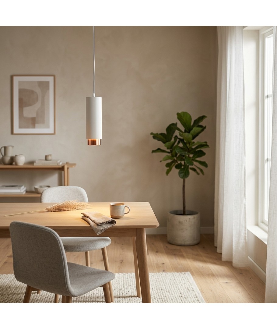 Denna moderna pendellampa kombinerar minimalistisk design med en touch av lyxig roséguld, vilket gör den till ett utmärkt val för både moderna och klassiska inredningsstilar. Lampans stilrena vita finish kompletterar den roséguldfärgade detaljen, vilket skapar en sofistikerad och tilltalande atmosfär i vilket rum som helst.