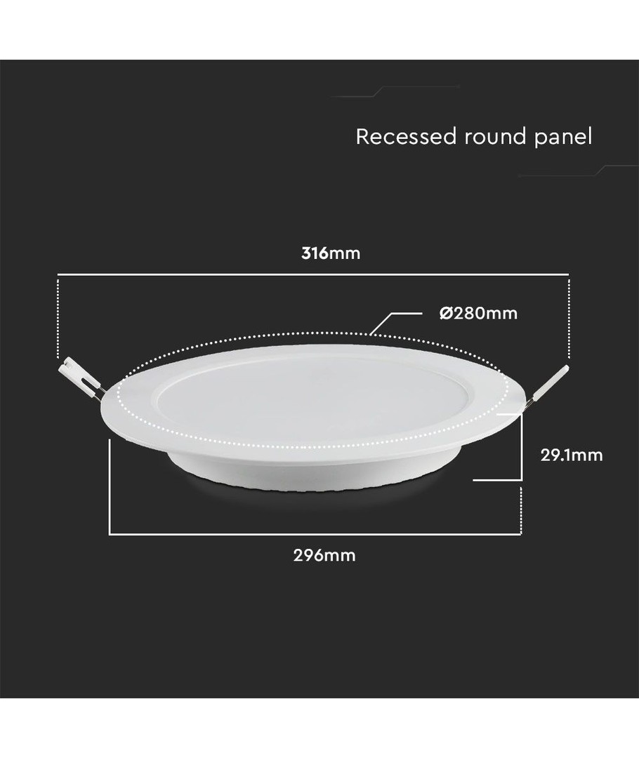 V-Tac LED downlight är designad för smidig installation i tak med en hålstorlek på 280 mm. Själva armaturen har måtten 29,1 x Ø296 mm. Den stiliga designen kombineras med riktningsbestämt ljus för att harmonisera med olika inredningsstilar.