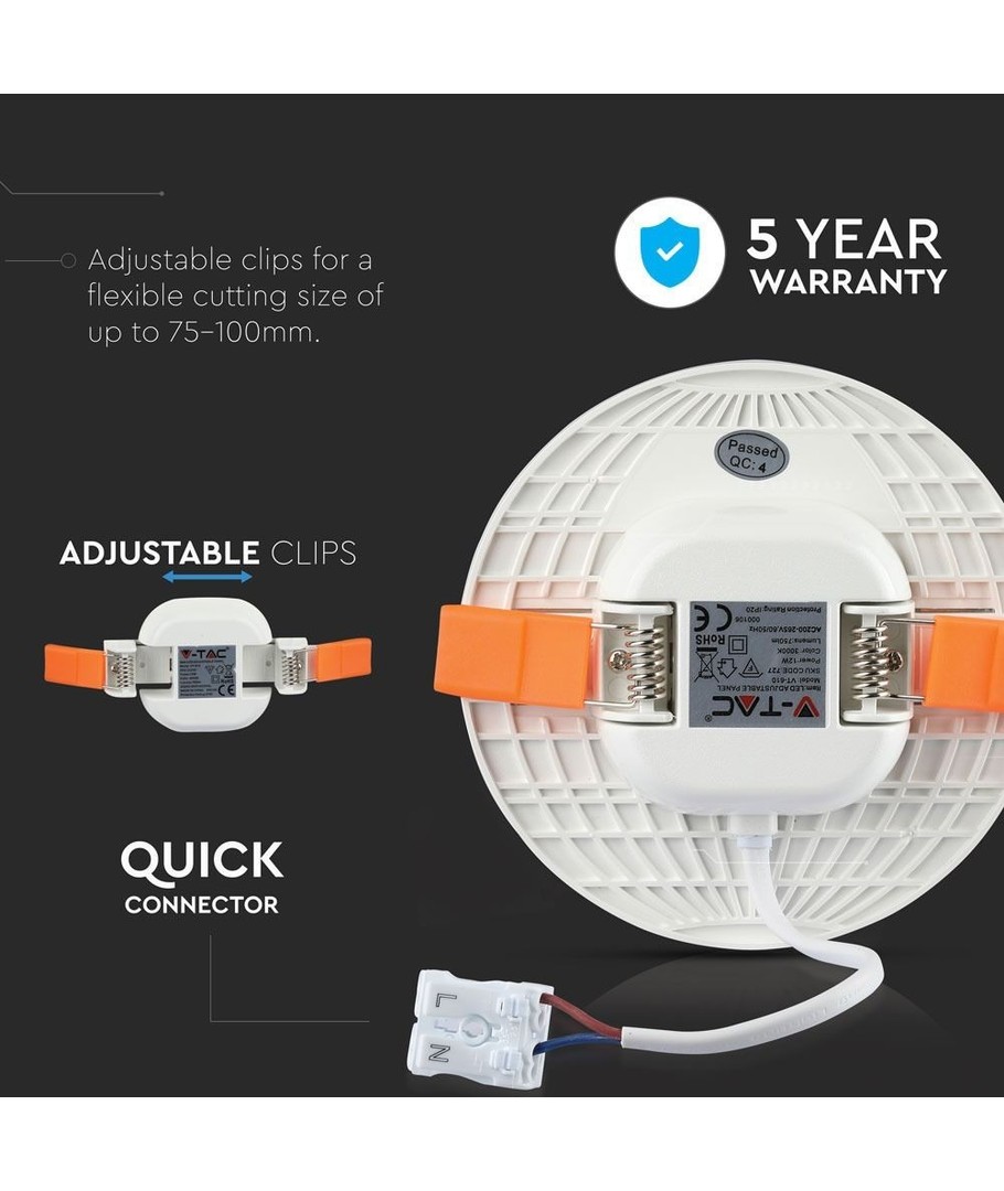 Denna LED-panel har en smidig och kompakt design med måtten 37 x Ø12 mm, vilket gör den enkel att installera. Hålstorleken för infällning är Ø7,5 cm.