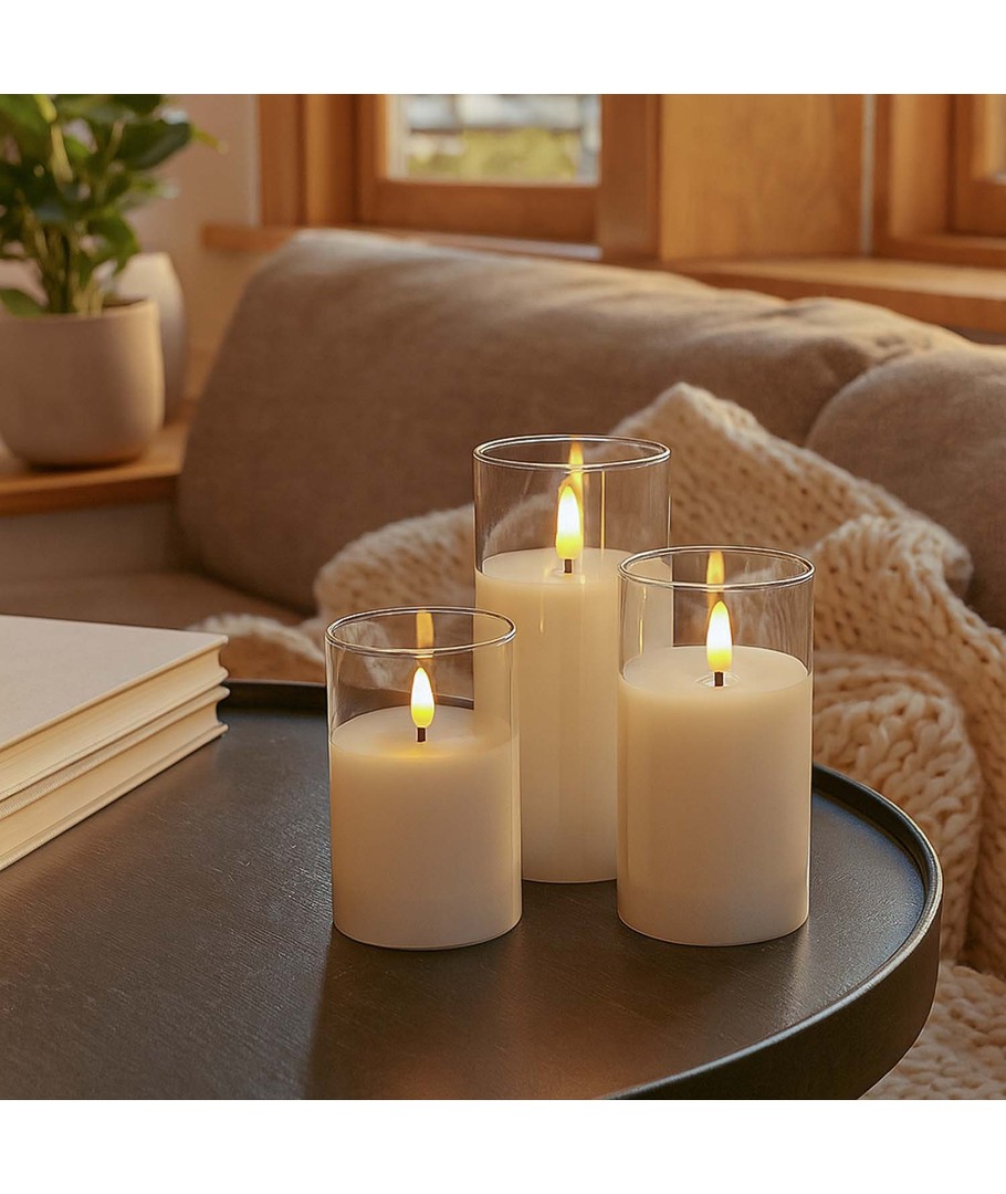 Upplev den varma och mysiga atmosfär som LED Blockljus set i glas ger till ditt hem. Detta set med tre blockljus låter dig njuta av den vackra flameffekten utan besväret med rök eller brandrisk.