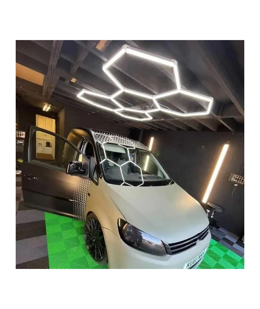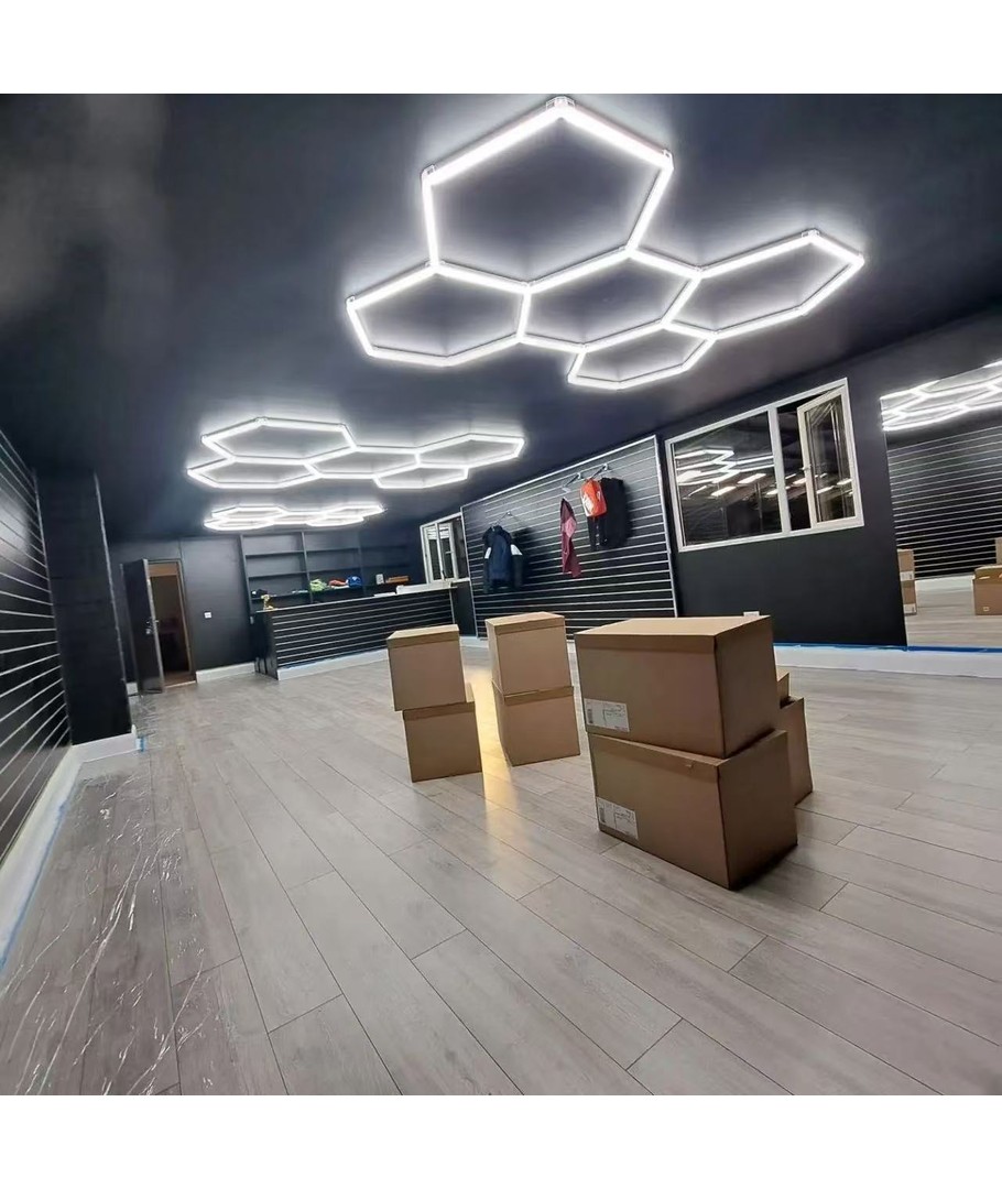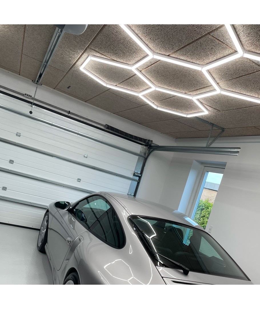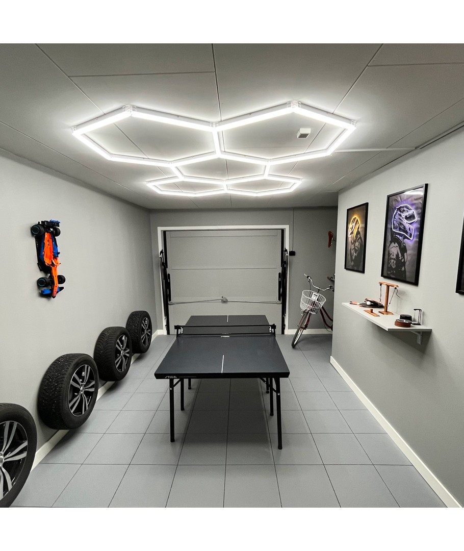 Detta moderna belysningsset erbjuder oöverträffad ljuskvalitet med sina fem hexagonala LED-fält. Designad för att skapa en lysande och jämn ljusfördelning över 180 grader, så att varje vrå av rummet badar i klart och naturligt ljus.