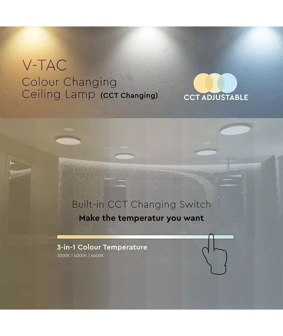 Denna V-Tac runda 24W LED taklampa erbjuder en modern och stilren design som smälter in i vilket interiör som helst. Lampan är utrustad med en praktisk CCT-funktion, vilket betyder att den kan justera mellan tre olika ljusfärger beroende på ditt behov och stämning.