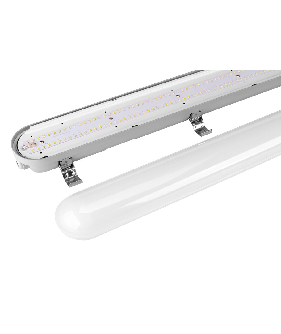 Armaturen levererar ett enhetligt, behagligt ljus med hög färgåtergivning (RA90) och stor spridning. Med IP65 är den lämplig för både industriella miljöer, lager, produktionslokaler samt områden med damm och fukt.
