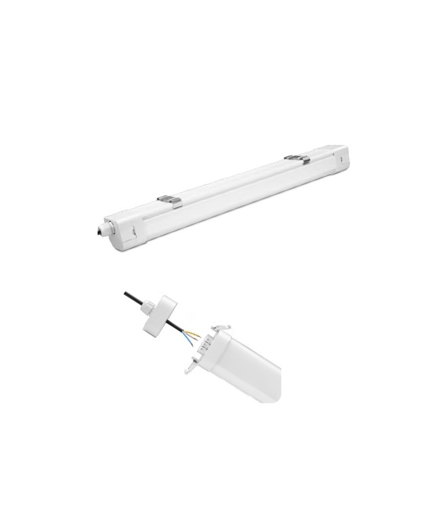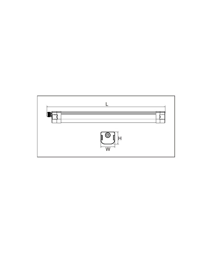 Armaturen har dimensionerna 1221 x 74 x 64 mm och är robust konstruerad för att klara även mer krävande miljöer med sin IP65-klassning. Denna klassificering säkerställer att den är vattenavvisande och kan användas utomhus, vilket gör den idealisk för olika typer av installationer.