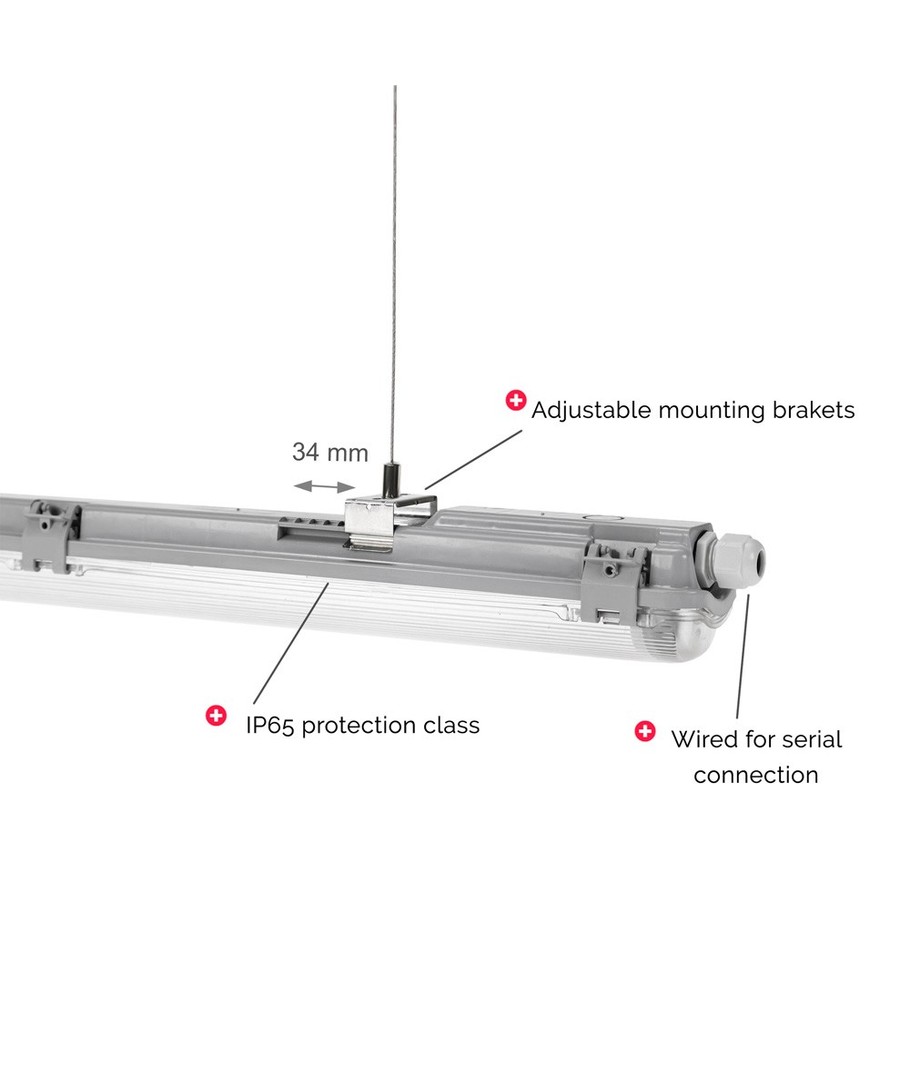 Armaturen kommer med 2x9W 60cm LED-rör som enkelt ansluts till 230V. Tack vare sin ljusstyrka på 2000 lm och en bred spridning på 270 grader säkerställs en jämn och effektiv fördelning av ljuset i alla riktningar.