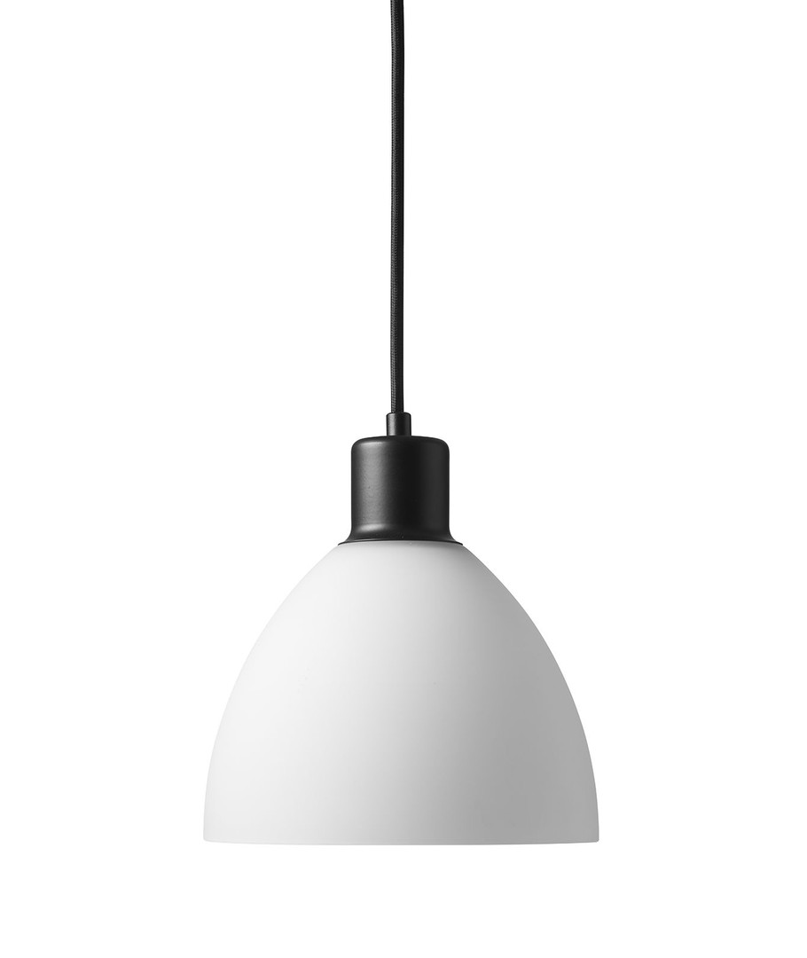 1 pendel i opalglas med mattsvarta socklar upphängd i svart textilkabel.