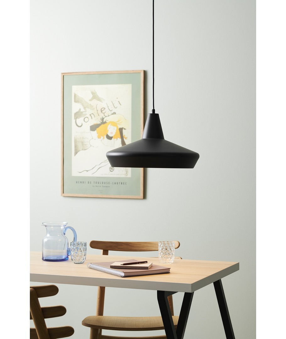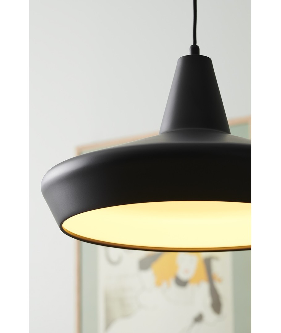 Denna pendellampa från Halo Design har en enkel men sofistikerad design. Den svarta ytan kompletterar inredningen i de flesta moderna hem och kan utgöra en elegant mittpunkt i rummet. Det minimalistiska utseendet gör att den fungerar både som en praktisk ljuskälla och en dekorativ inredningsdetalj.