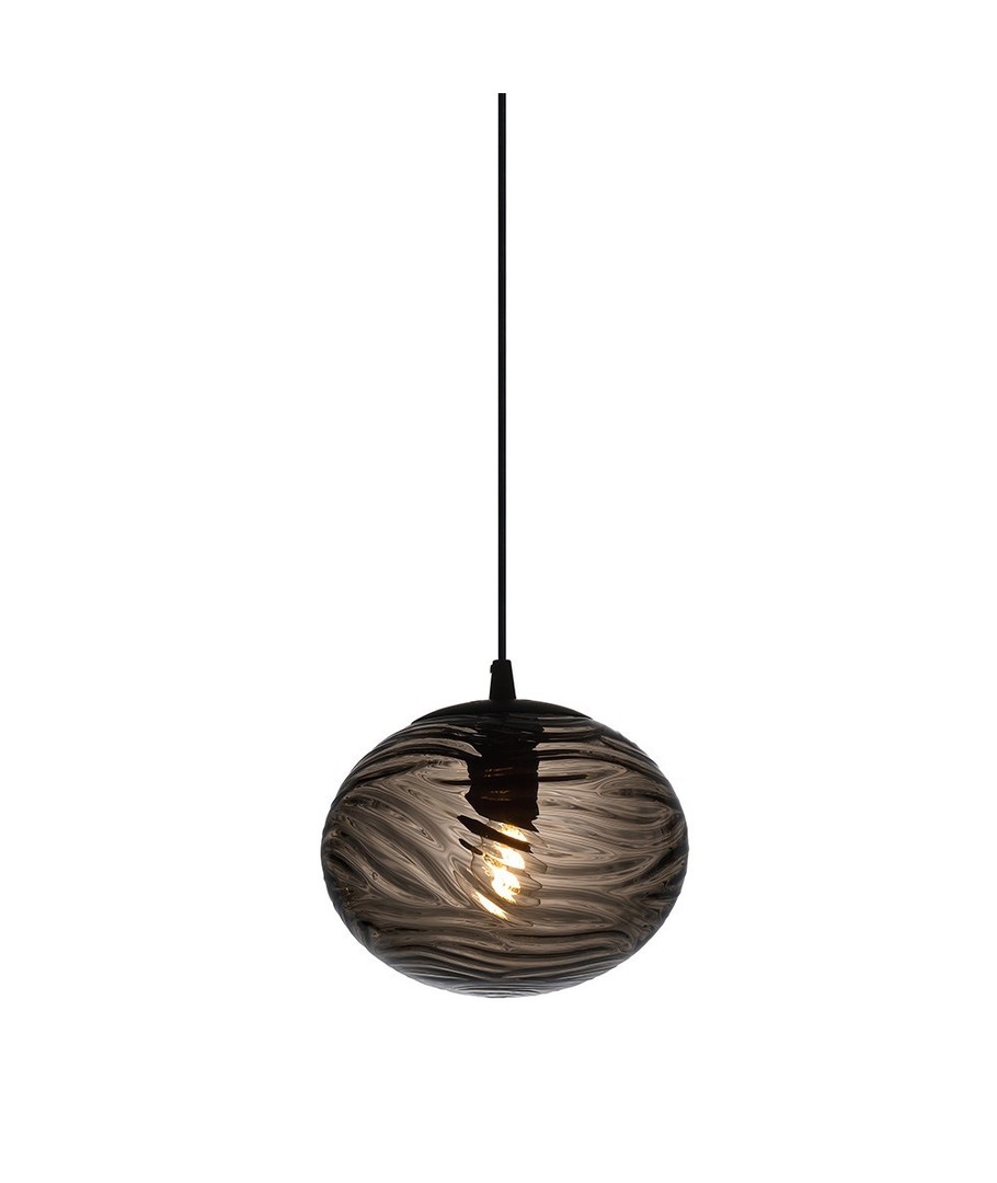 Lampan hänger i en elegant tygkabel, vilket bidrar till den estetiska helheten och skapar en mjuk och naturlig känsla. Kombinationen av rökfärgat glas och tygdetaljer skapar ett intrikat ljusspel som fångar och fascinerar.