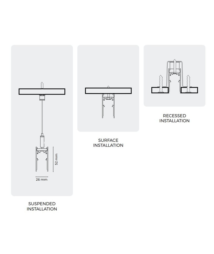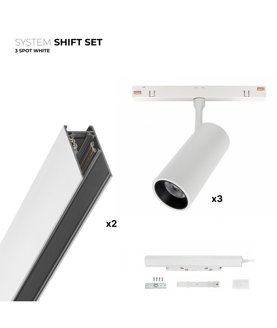 Med SHIFT 3x spotset får du 2x 1 meters skenor och 3x LED-spots, samt allt du behöver för att installera den.