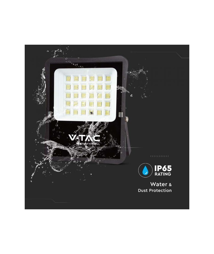 V-Tac Solar LED-strålkastare är konstruerad för att användas utomhus med IP65-klassificering. Den är motståndskraftig mot vattenstänk och regn, vilket gör den idealisk för alla typer av väderförhållanden.
