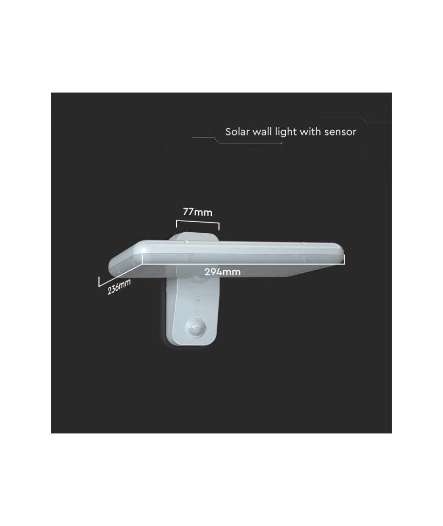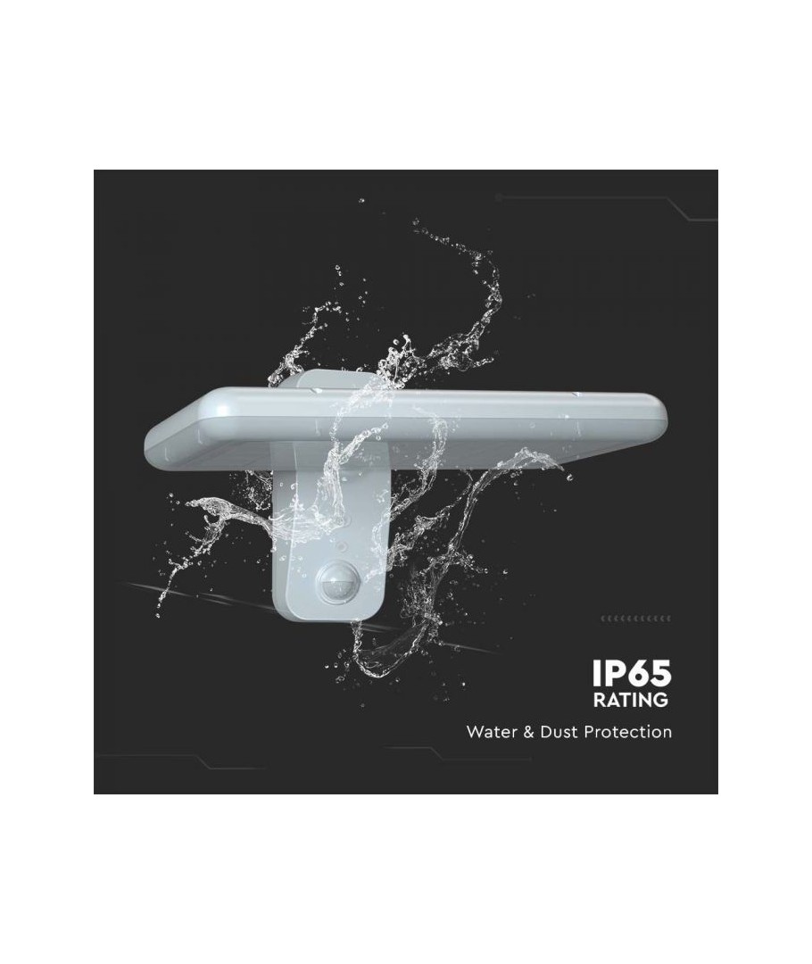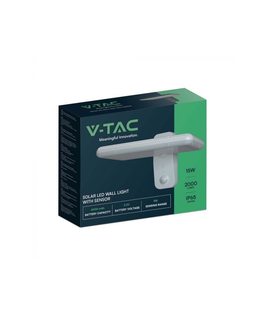 Uppgradera ditt utomhusområde med V-Tac 15W LED Solar vägglampa. Denna svarta vägglampa är utrustad med en sensor och har en hög skyddsgrad IP65, vilket gör den lämplig för utomhusbruk.
