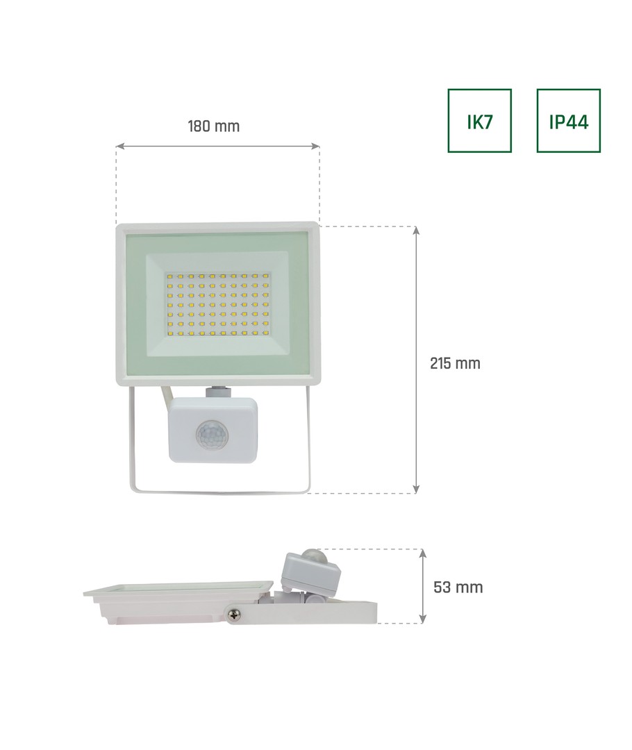 Med dimensionerna 215 x 53 x 180 mm, är strålkastaren både kompakt och diskret. Dess IP44-klassificering gör den resistent mot fukt och vattenstänk, vilket gör den idealisk för utomhusbruk, även i utmanande väderförhållanden.