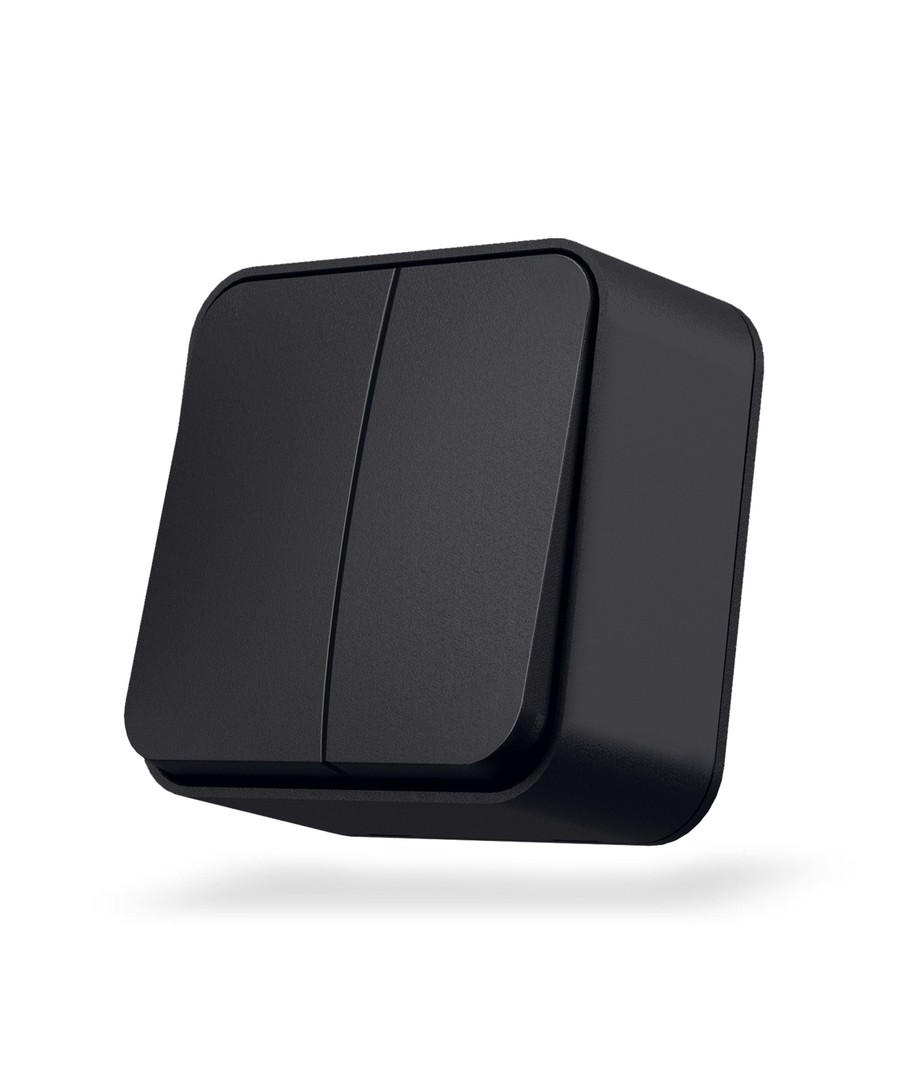 Den 2-kanals utanpåliggande brytaren i svart färg är en elegant och funktionell lösning för styrning av elektriska installationer i hemmet eller på kontoret, som skapar både säkerhet och stil.
