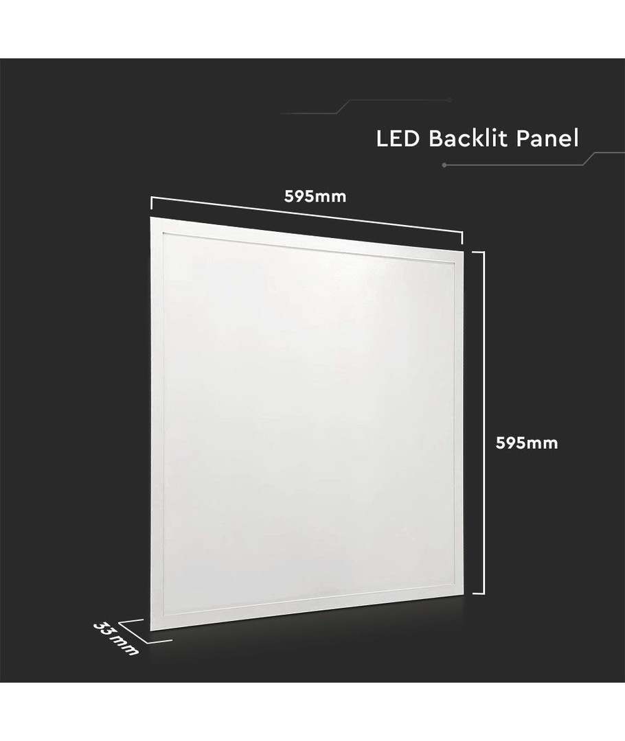 Den är anslutningsbar till 230V och har en integrerad ljuskälla för enkel installation. Panelen har en snygg vit kant och måtten 595 x 33 x 595 mm, vilket gör den till ett elegant och modernt tillskott till ditt tak.