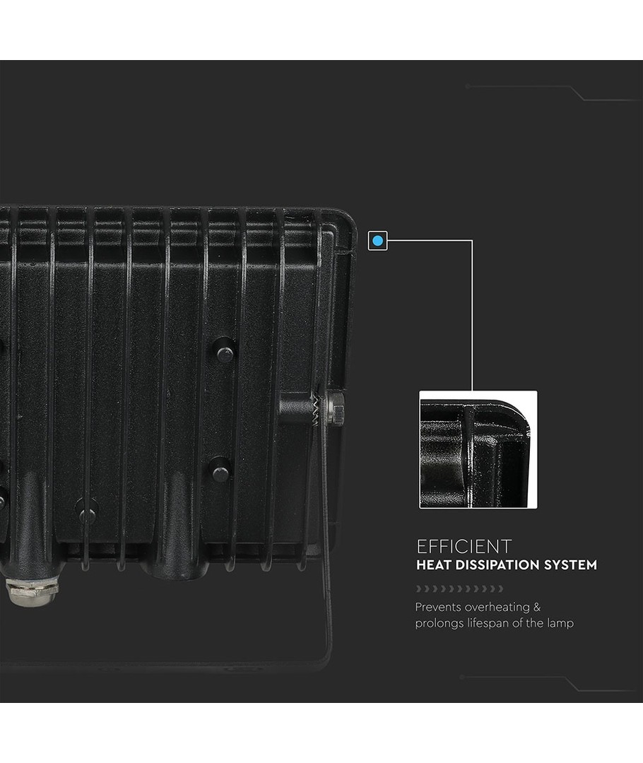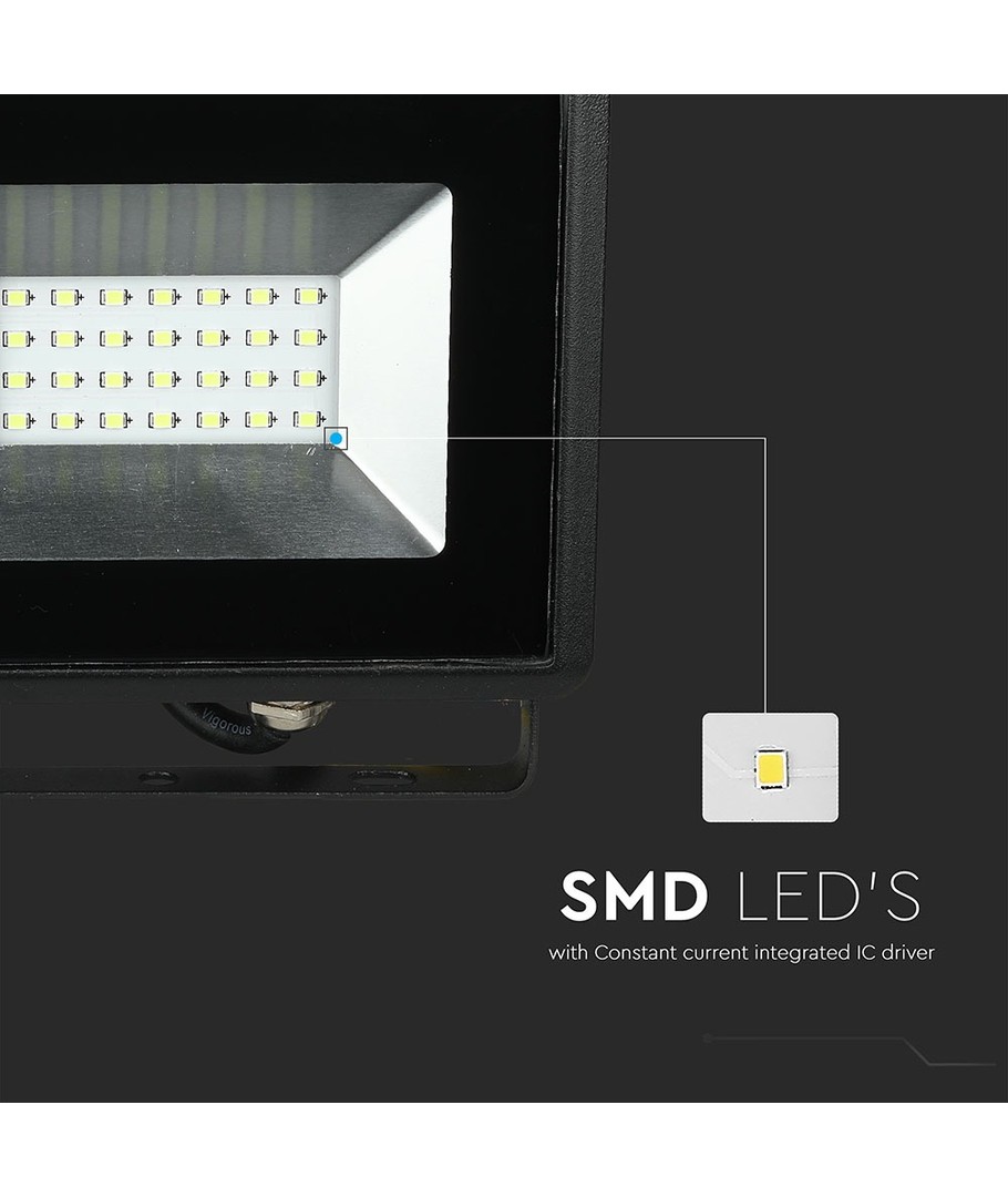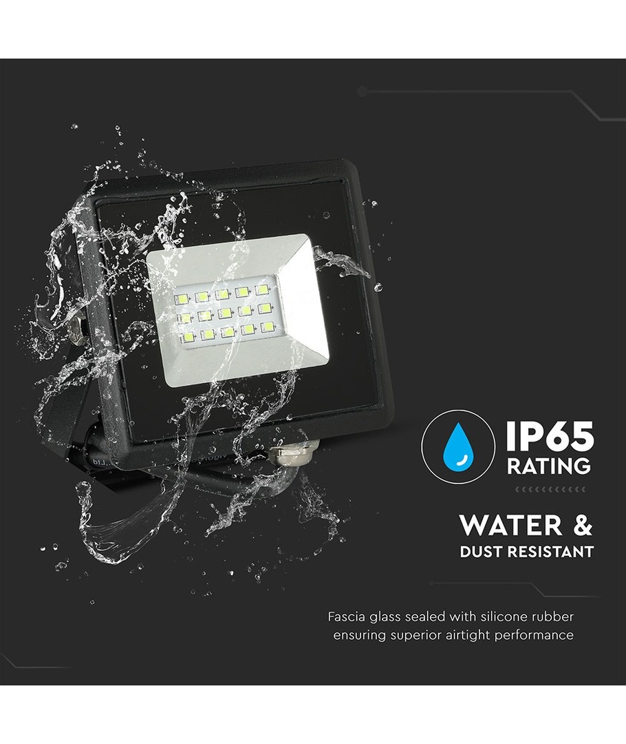 Konstruktionen mäter 150 x 26 x 143 mm och är robust och kompakt. Denna LED-projektor har en IP65-klassificering, vilket innebär att den är skyddad mot damm och vattenstänk, vilket gör den idealisk för utomhusbruk i alla väderförhållanden.