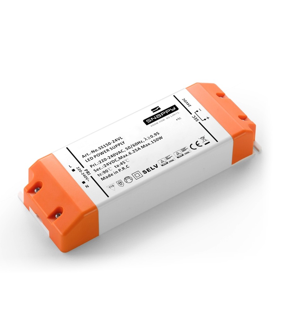 Kvalitets LED-driver från Snappy på 1-150W som levererar en konstant spänning på 24V DC. Rekommenderas inte för LED-lampor.