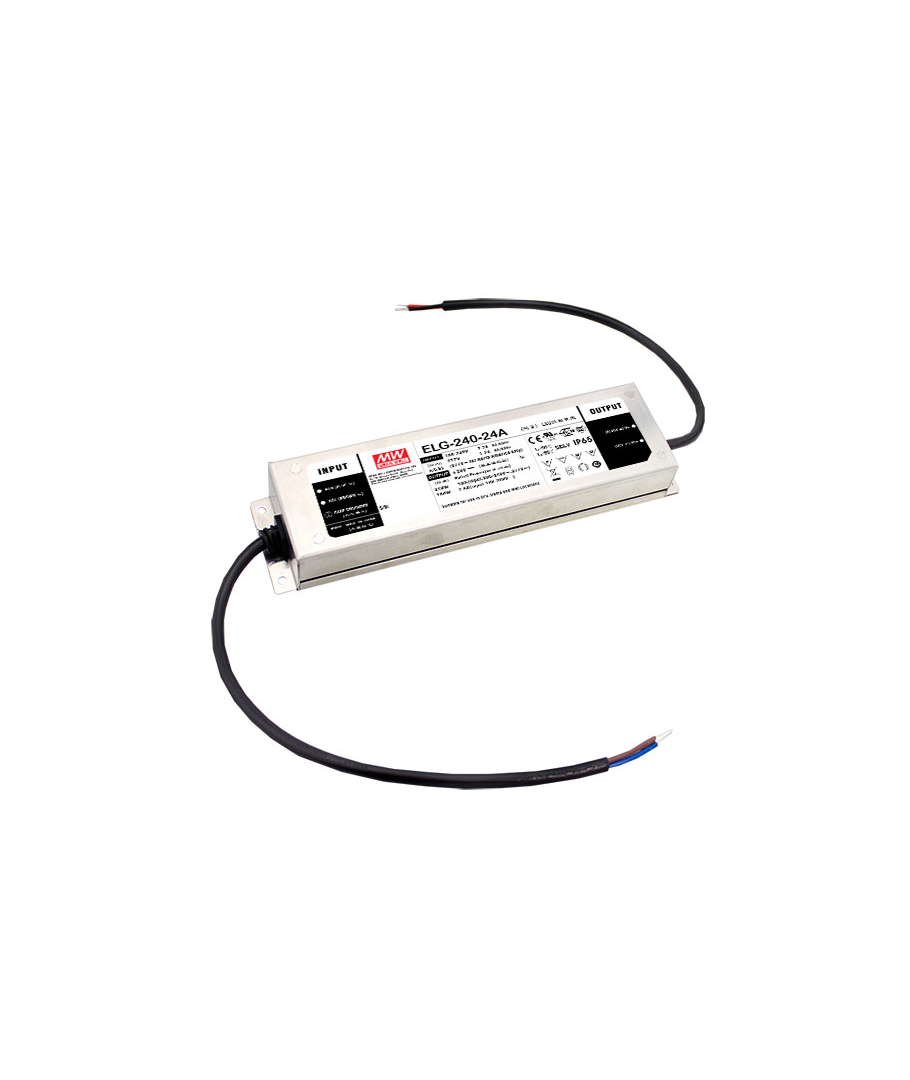 Dimbar kvalitets LED strömförsörjning från Mean Well för 230VAC. Mixed Mode utgång (spänningsstabiliserad till maximal ström med efterföljande strömstabilisering C.V. + C.C.), LED drivern är IP67 godkänd för inomhus- och utomhusbruk.