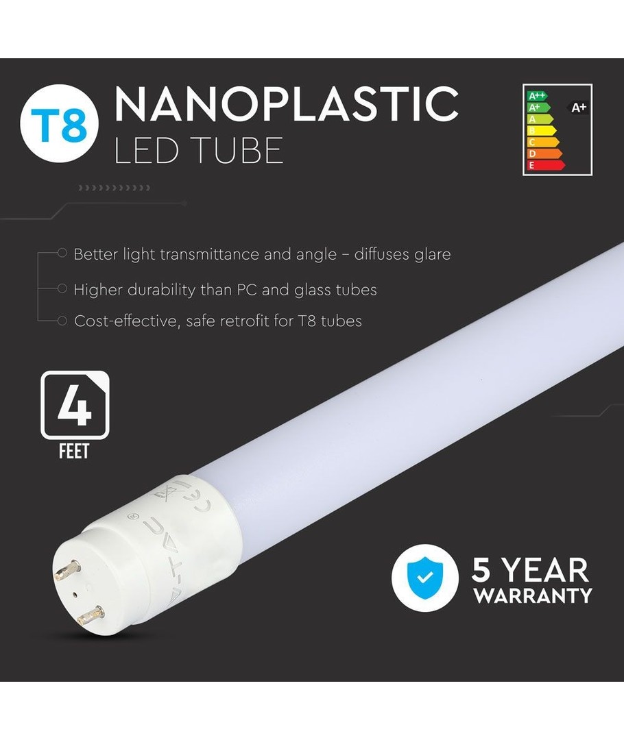 Med en förbrukning på endast 18W, ersätter detta 120 cm T8 LED-lysrör effektivt ett traditionellt 36W lysrör. Dess ljusstyrka på 1700 lm i kombination med en bred ljusvinkel på 160 grader säkerställer en jämn ljusfördelning.