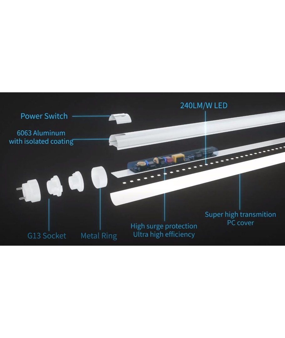 Ge din belysning ett lyft med detta högpresterande LED-rör som kombinerar energieffektivitet med modern teknologi. Med förmågan att byta ut traditionella 58W lysrör erbjuder detta LED-alternativ en kraftfull ljusstyrka på 4800 lumen, vilket säkerställer en bred och jämn ljusfördelning tack vare en spridningsvinkel på 140 grader.