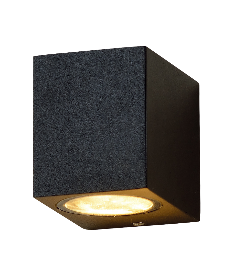 Modern, kompakt och prisvärd vägglampa för montering utomhus på väggar under takfot och andra platser där vatten inte rinner nerför väggen och bakom lampan.
