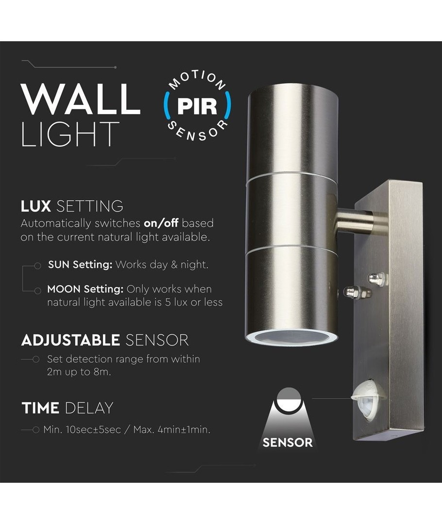 Denna vägglampa är tillverkad i rostfritt stål, vilket inte bara ger ett modern utseende men också gör den extra hållbar mot väderpåverkan. Med en stilren finish blir lampan ett elegant inslag i varje miljö.