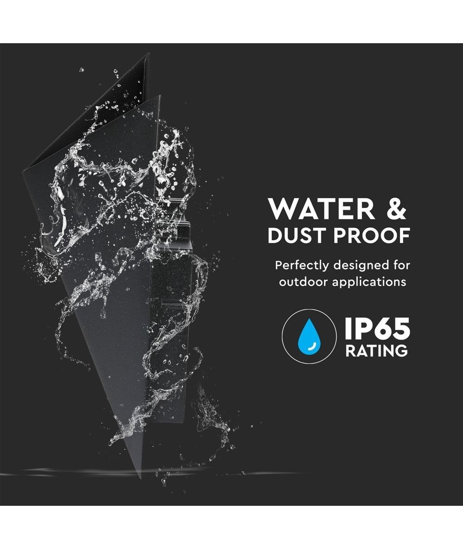 Med en IP65-klassning är denna vägglampa speciellt framtagen för att stå emot vattenstänk och regn, vilket gör den idealisk för utomhusinstallation. Den svarta, strama designen passar perfekt i alla miljöer och tillför en modern touch.