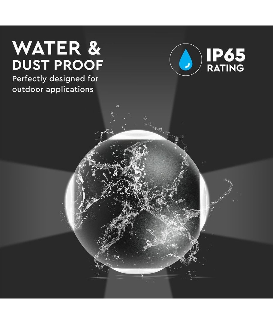 V-Tac 4W LED svart vägglampa är IP65-klassificerad vilket gör att den tål vattenstänk och regn och kan användas utomhus.