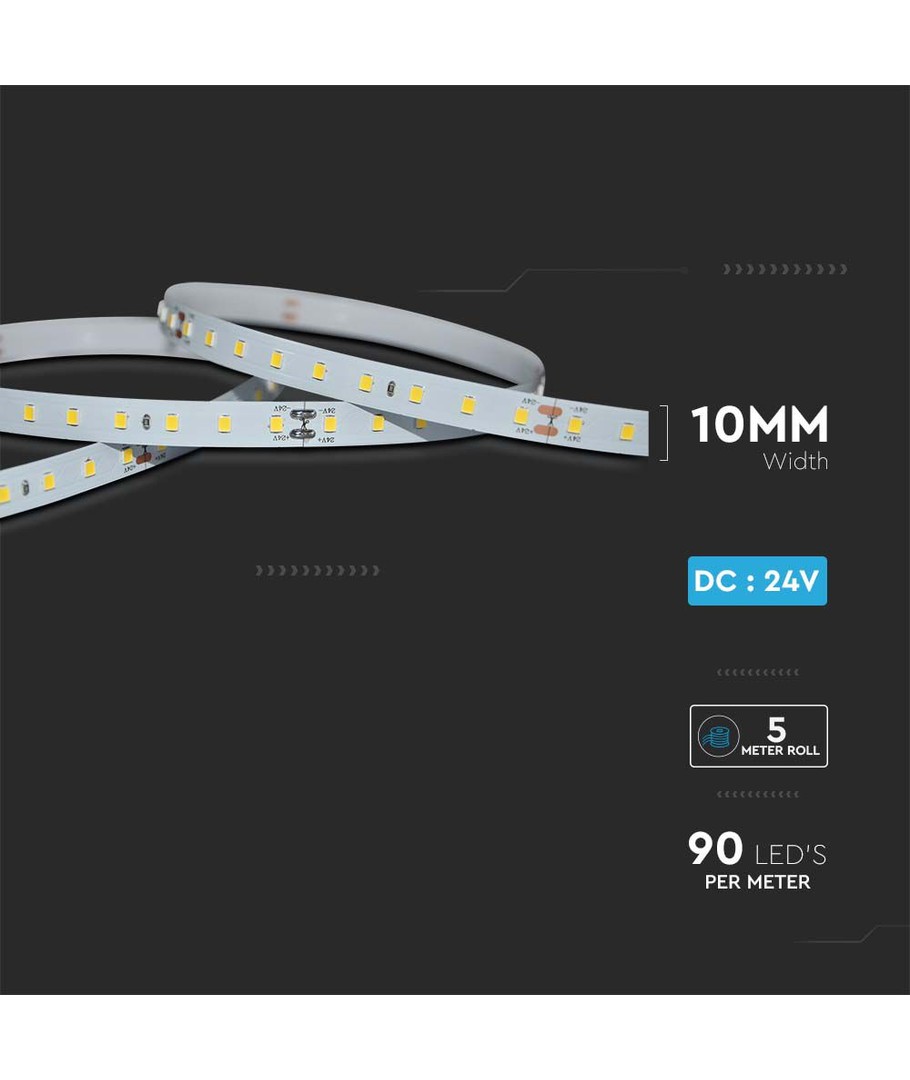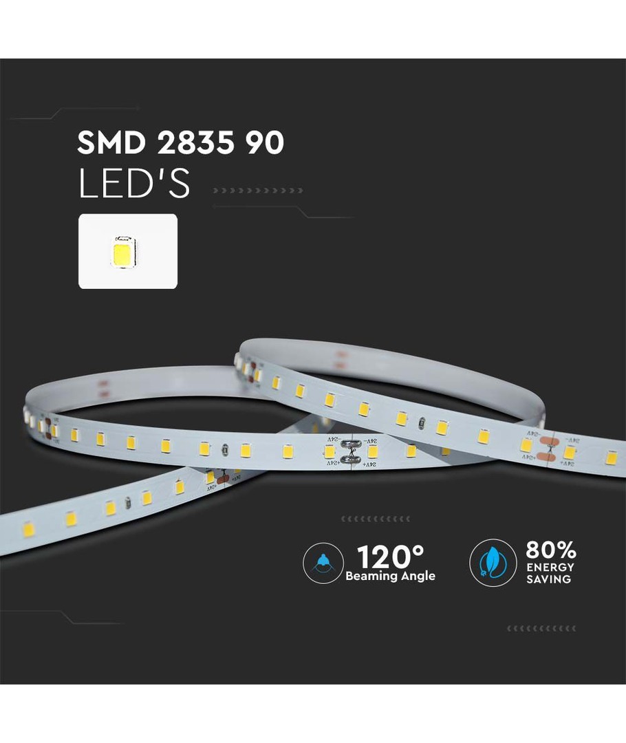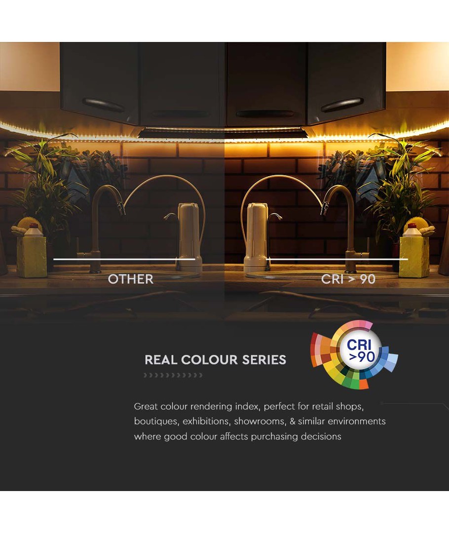Upplev en extra hög ljuskvalitet med denna LED-strip som erbjuder en exceptionell belysning på 90-95 RA. Detta garanterar ett livligt och naturligt ljus som troget återger alla färger.