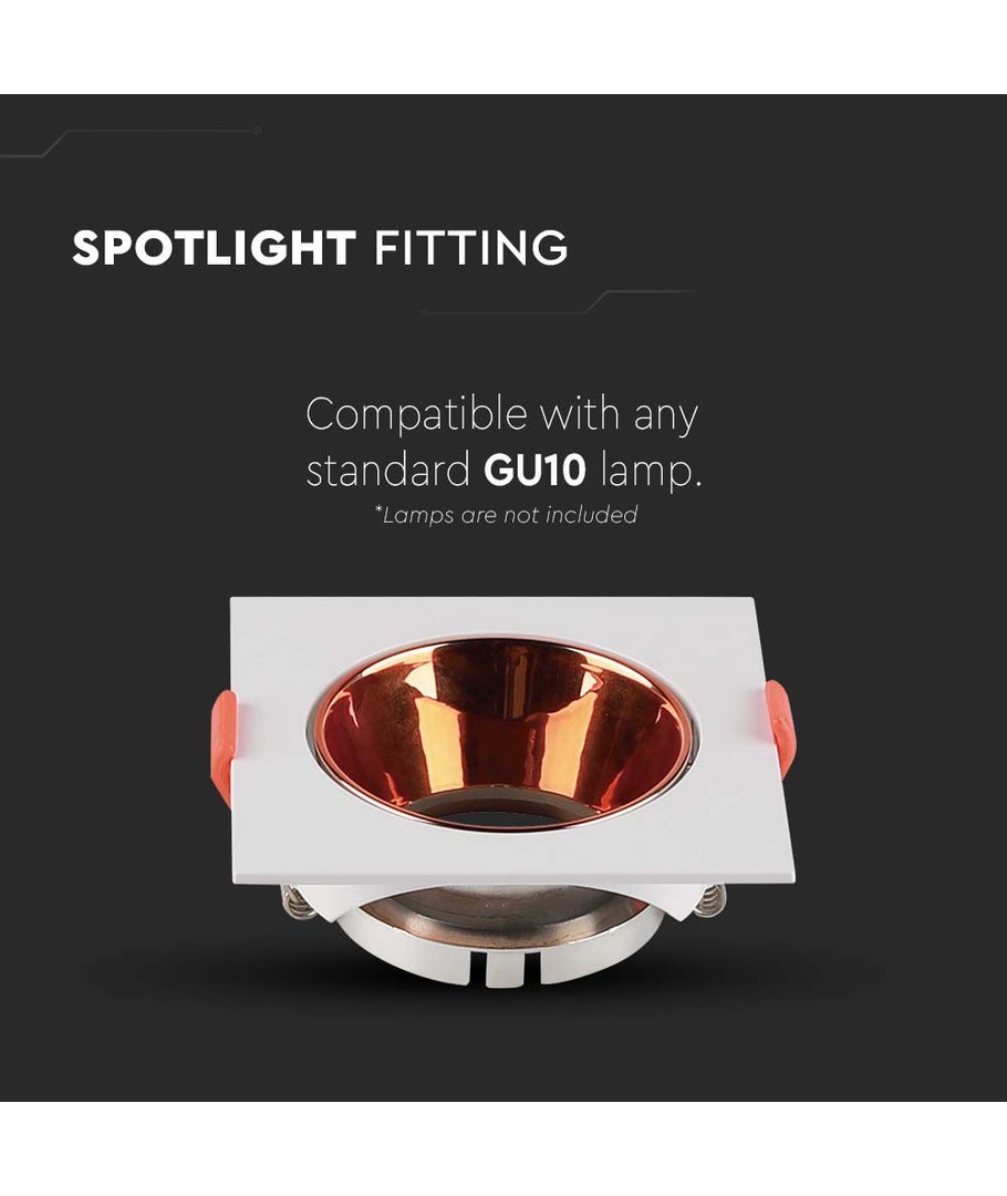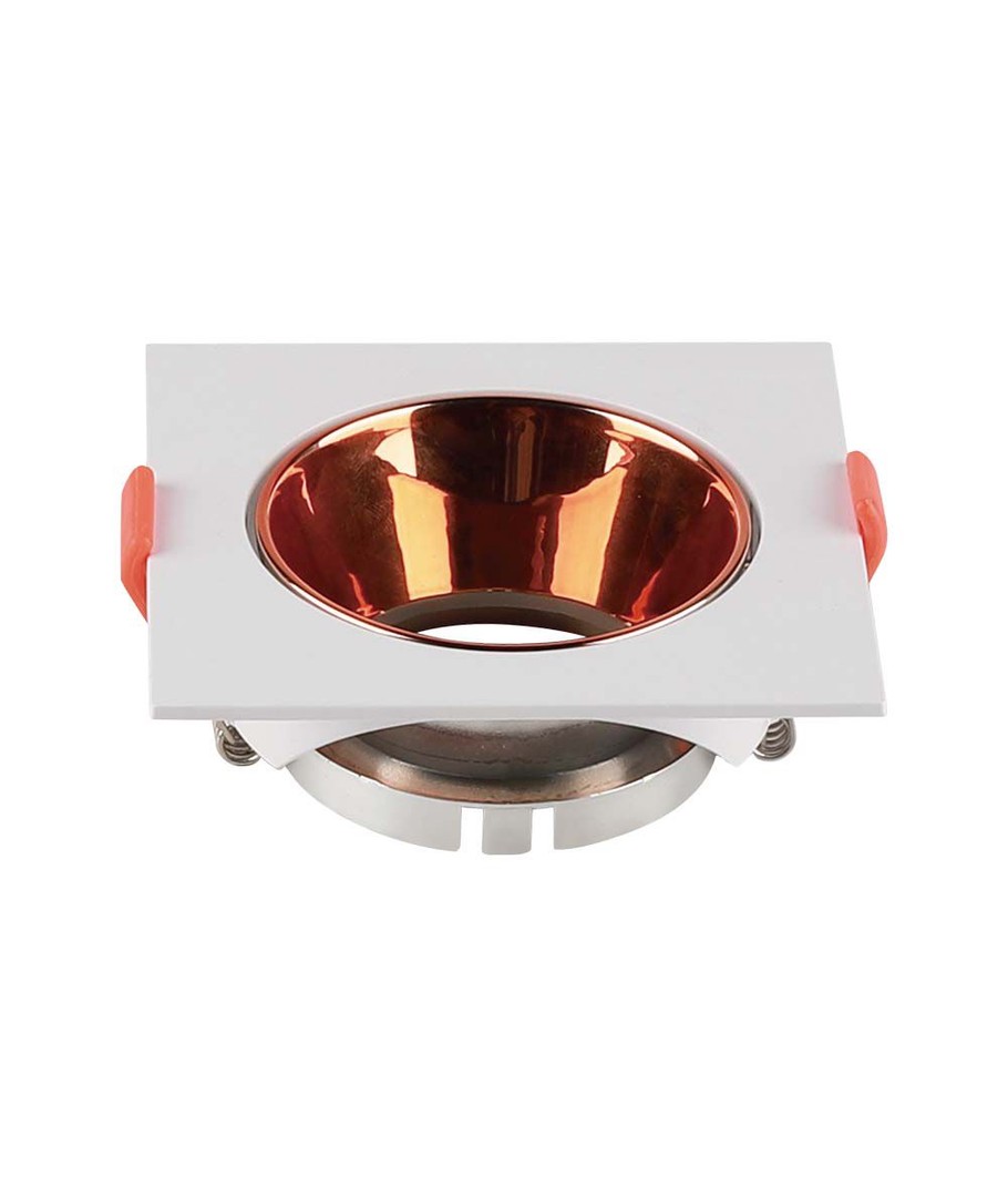 Den fyrkantiga lampan med vit ram och rosaguld reflektor erbjuder en distinkt och stilren design som kompletterar vilken interiör som helst. Perfekt för dem som söker en kombination av funktionalitet och estetik i sin belysning.